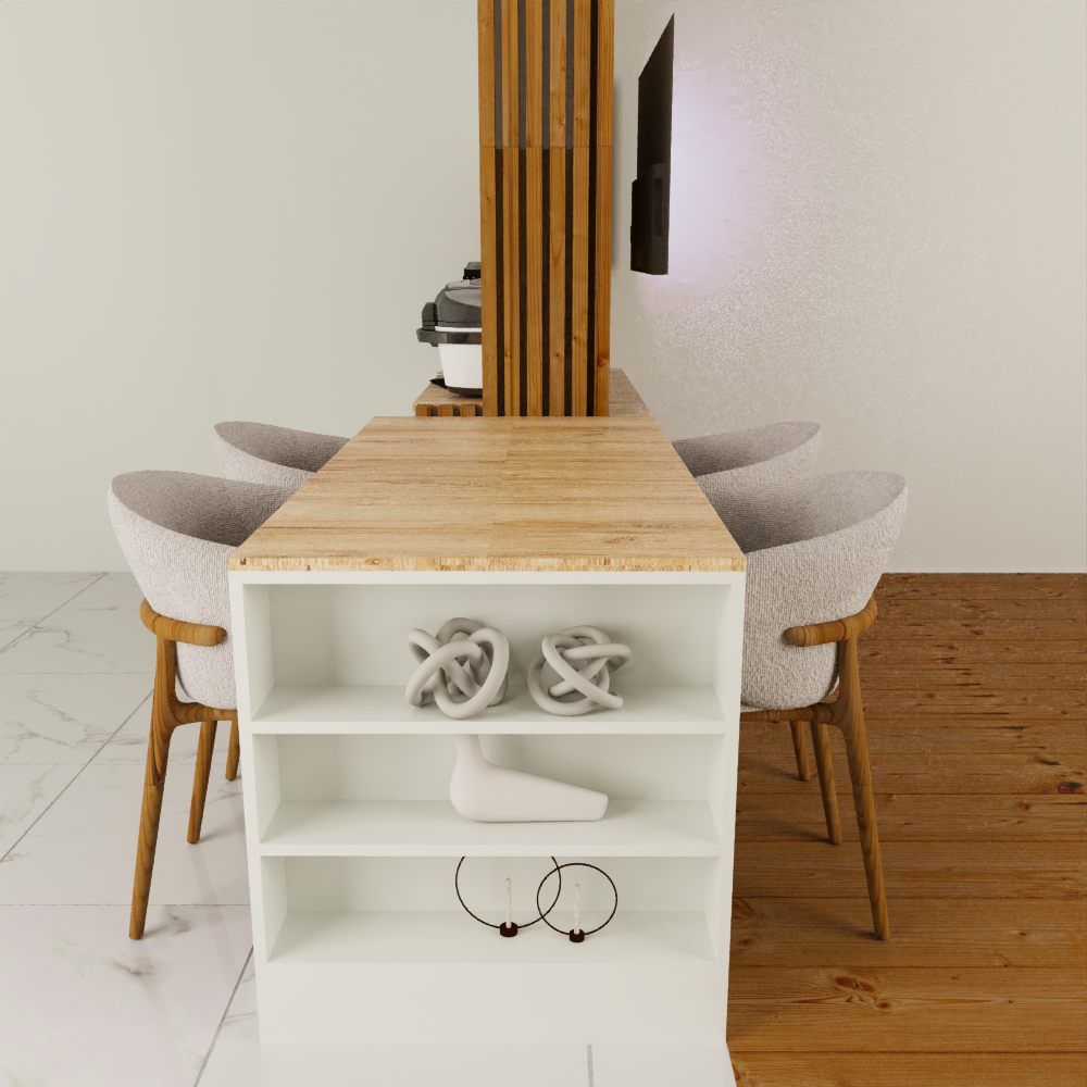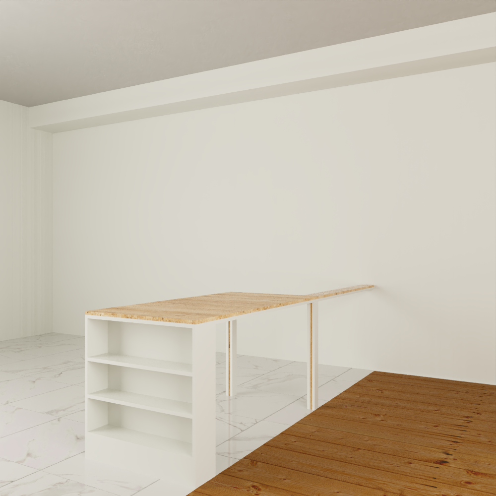 • 140x70 Özel İmalat Parlak Beyaz & Dokulu Mat Safir Meşe MDF Lam Masa ve Raf, tasarımındaki meşe detaylar ile beyaz alt tabla ve açık raf kombinasyonu, fonksiyon ve şıklığı birleştirir.