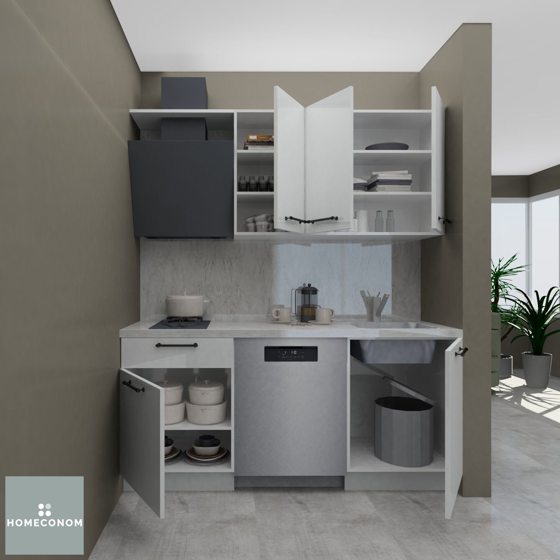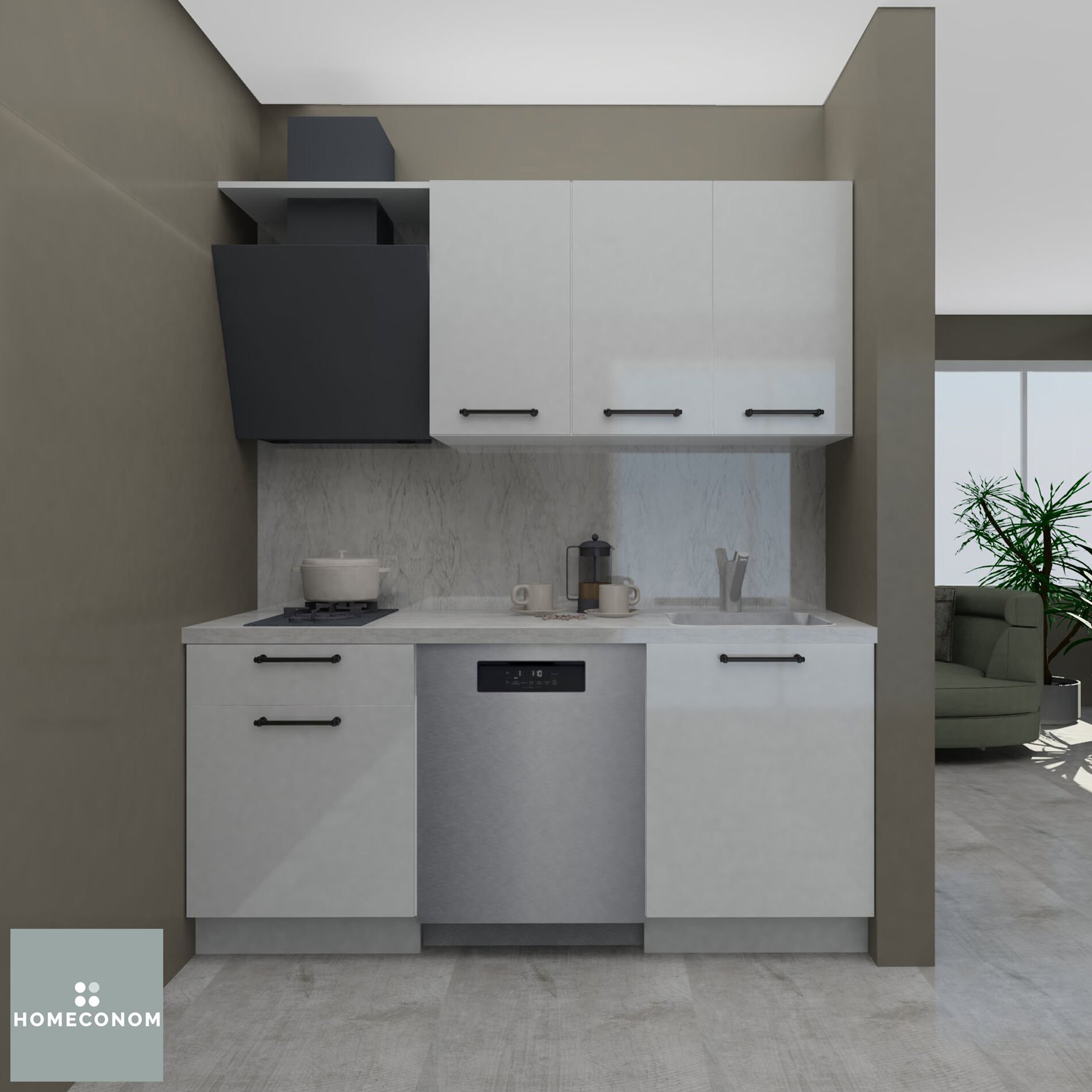 - Ürün görselinde bulunan; tezgah, duvar paneli / duvar seramiği, ankastre cihazlar, solo cihazlar, buzdolabı, evye ve armatür görsel amaçlı kullanılmış olup, içeriğe dahil değildir.