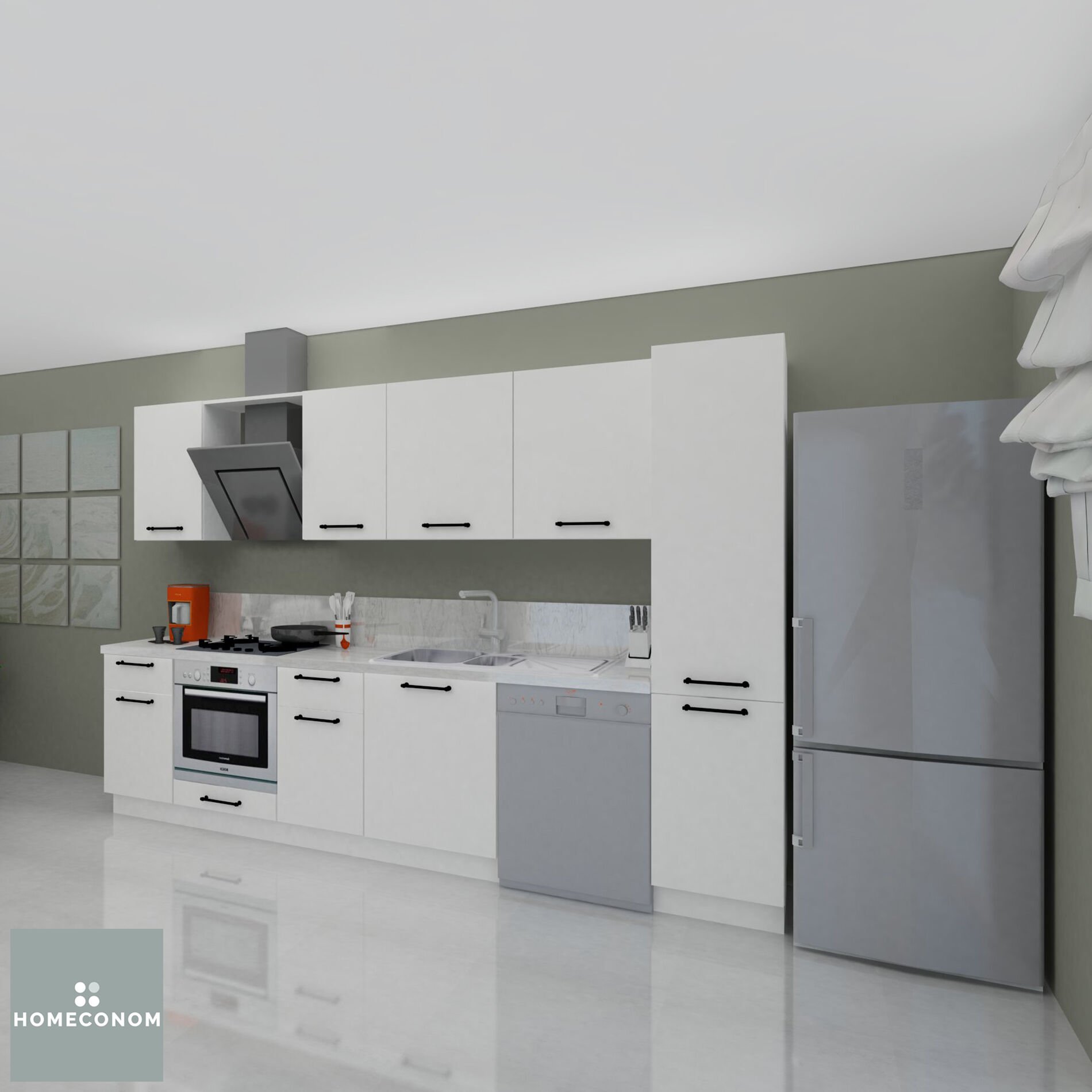 - Ürün görselinde bulunan; tezgah, duvar paneli / duvar seramiği, ankastre cihazlar, solo cihazlar, buzdolabı, evye ve armatür görsel amaçlı kullanılmış olup, içeriğe dahil değildir.