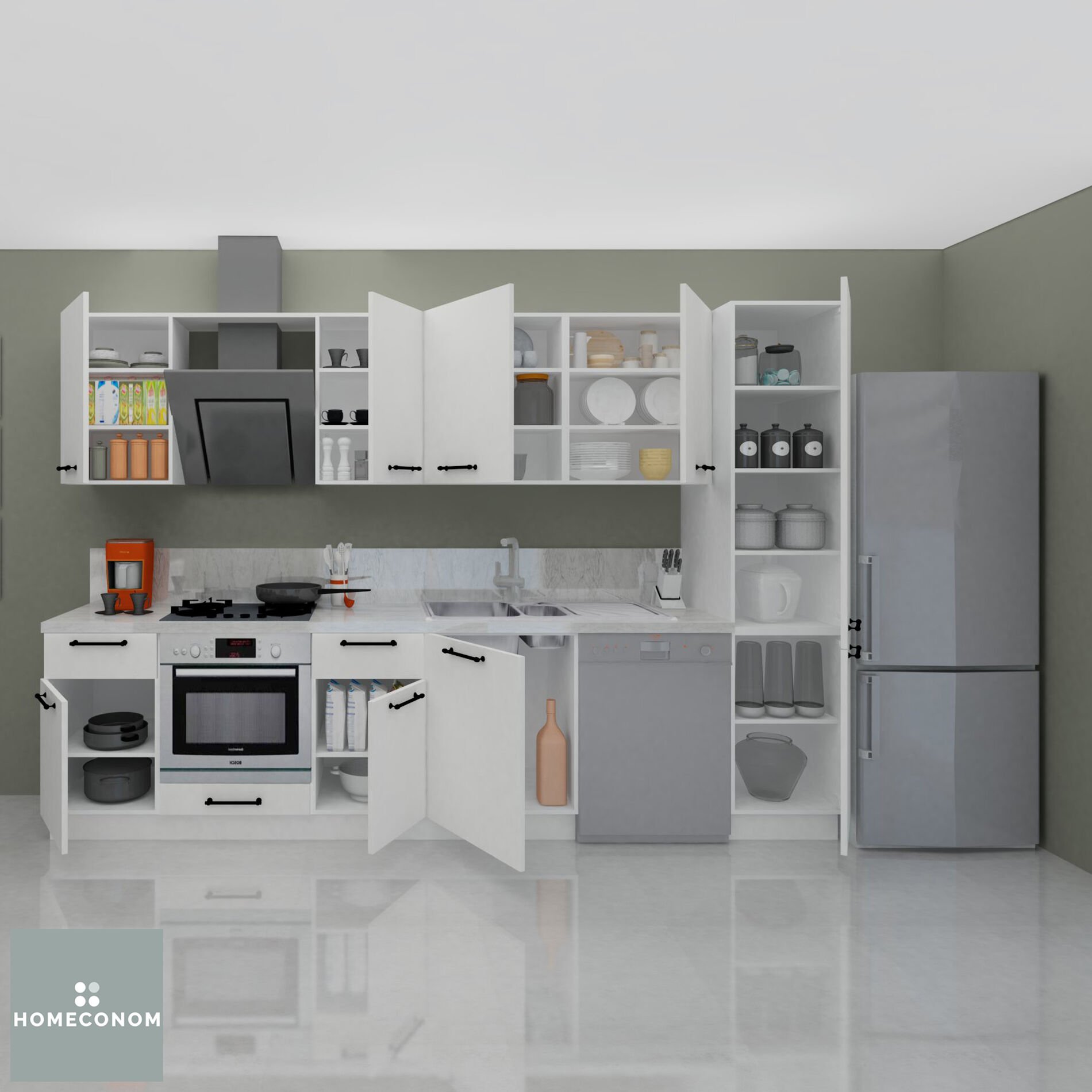 - ANGKOR PANTERY 315 Parlak Beyaz Mutfak dolaplarımız %100 MDFlam olarak üretilmektedir.