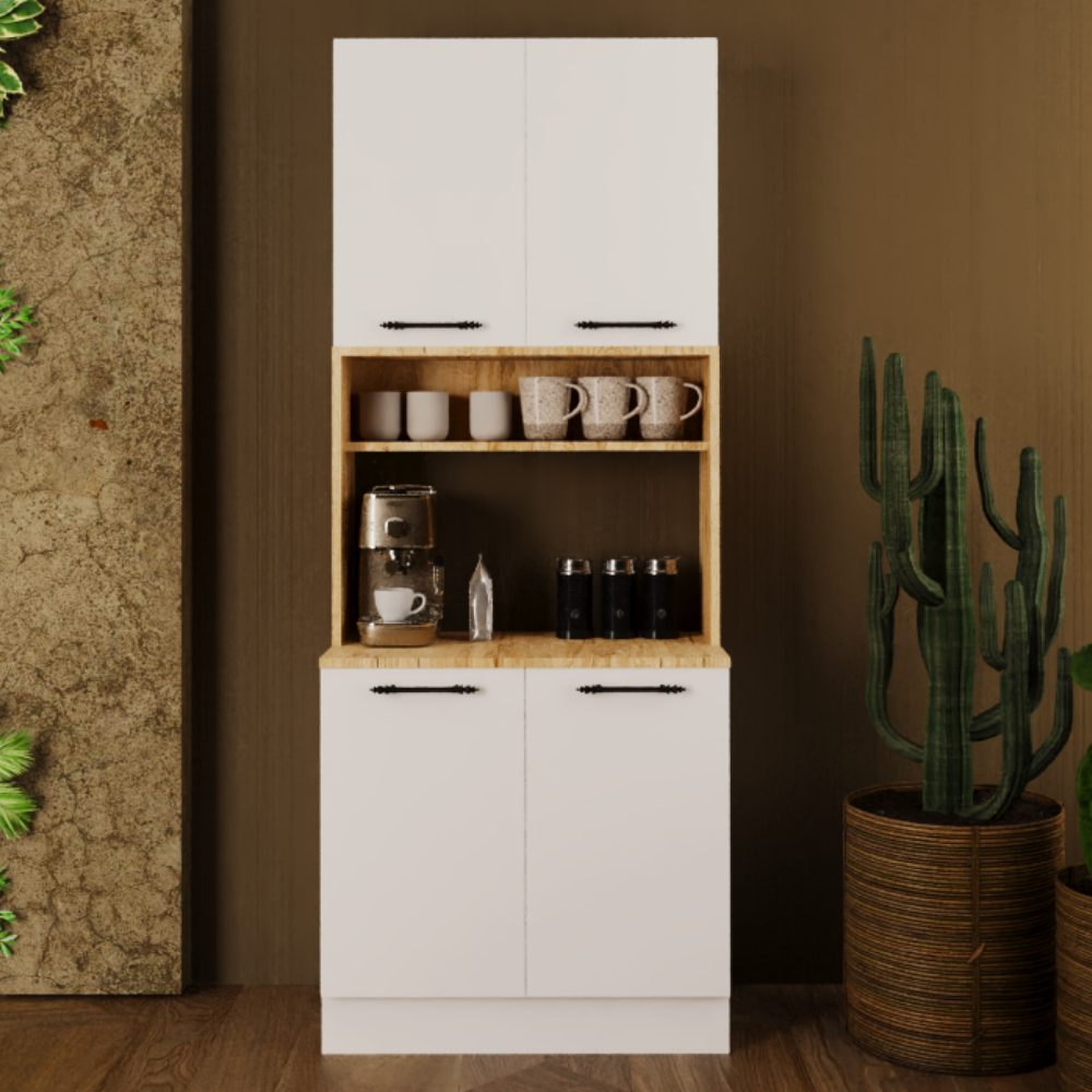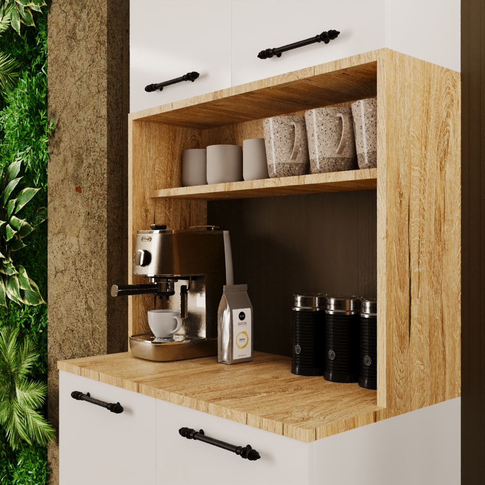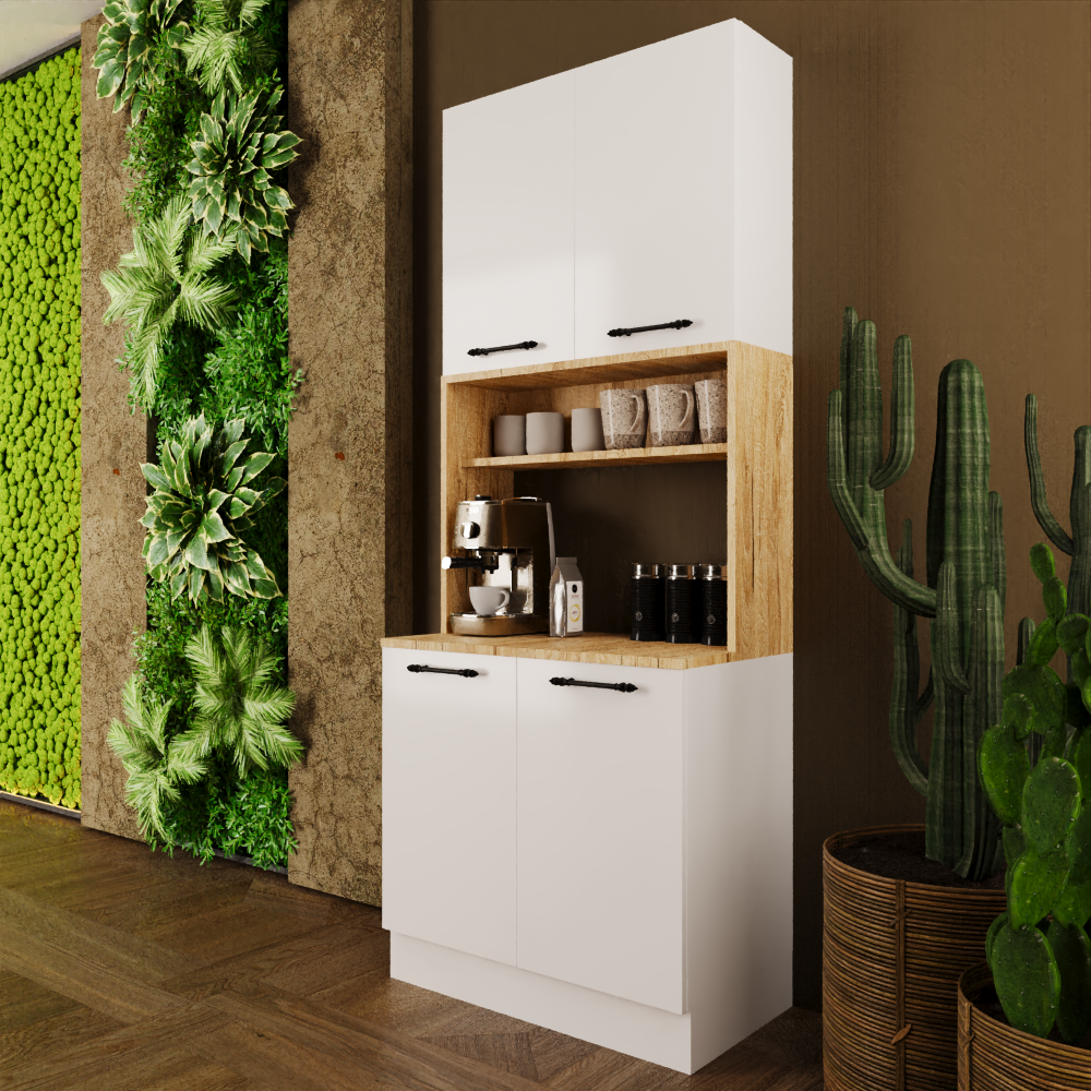 - Anitta 80 cm Mat Meşe & Mat Beyaz MDF Lam Kahve Köşesi, tasarımındaki meşe detaylar ile siyah kulp ve beyaz kapak kombinasyonu, fonksiyon ve şıklığı birleştirir.