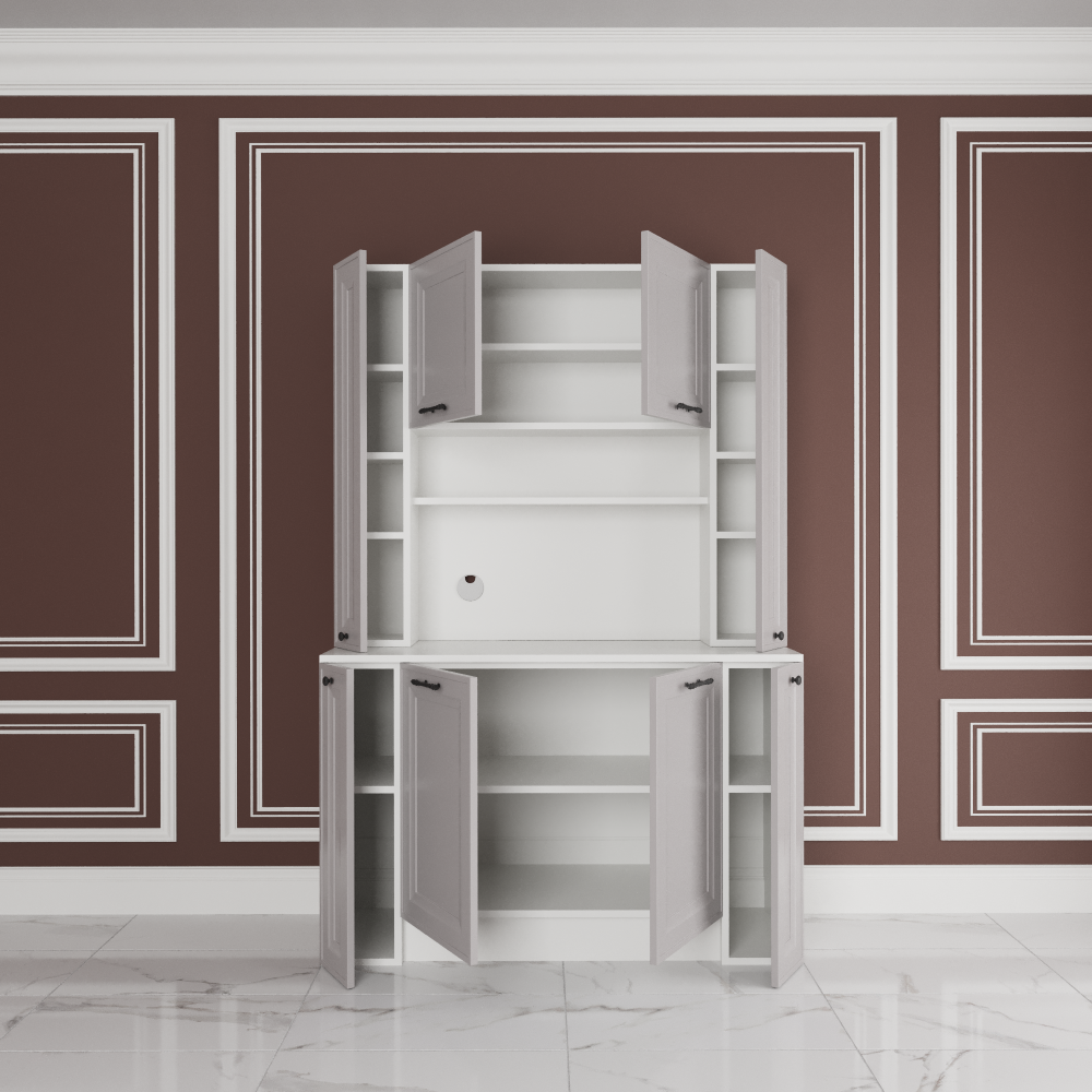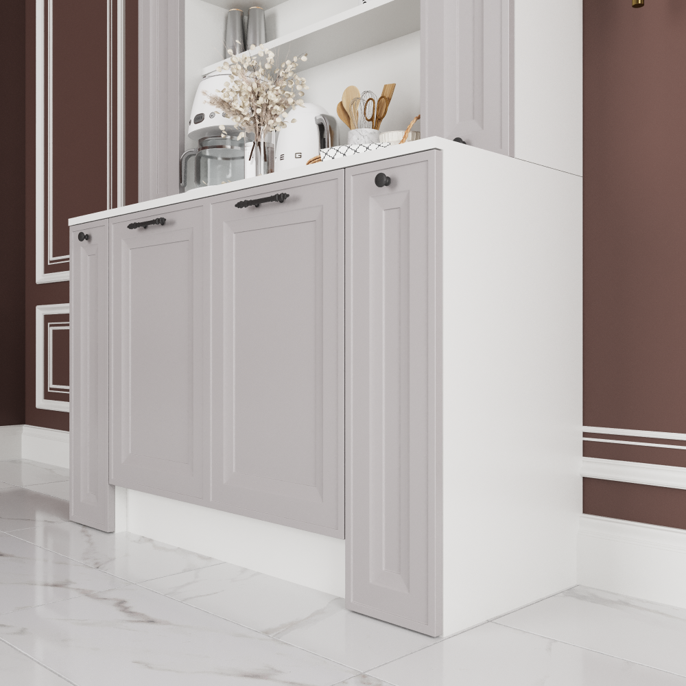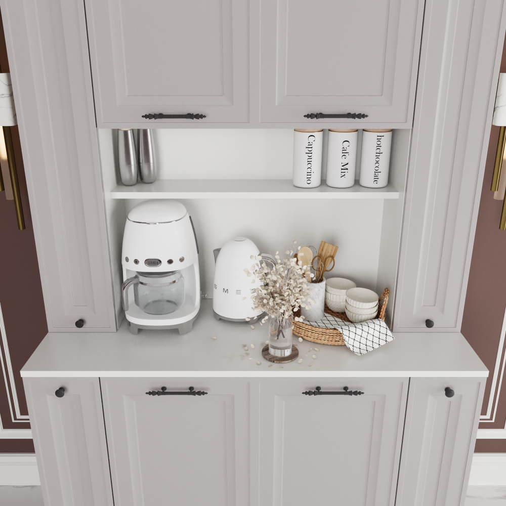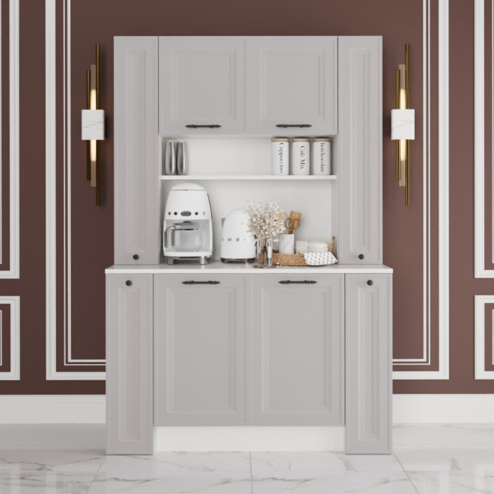 • Ürün sağ ve sol yanında bulunan yüksek dar dolaplar ekstra depolama alanı sağlarken, tepsiler, kesme tahtaları ve özel kahve fincanları için ayrı bir yer sunar.