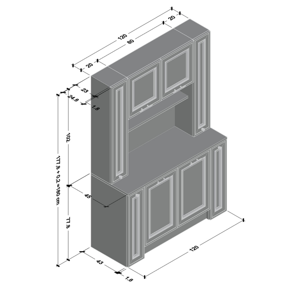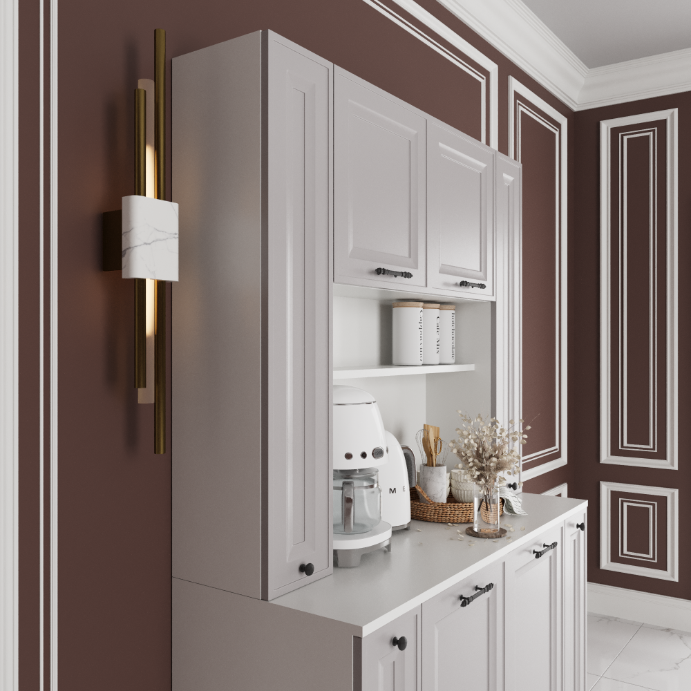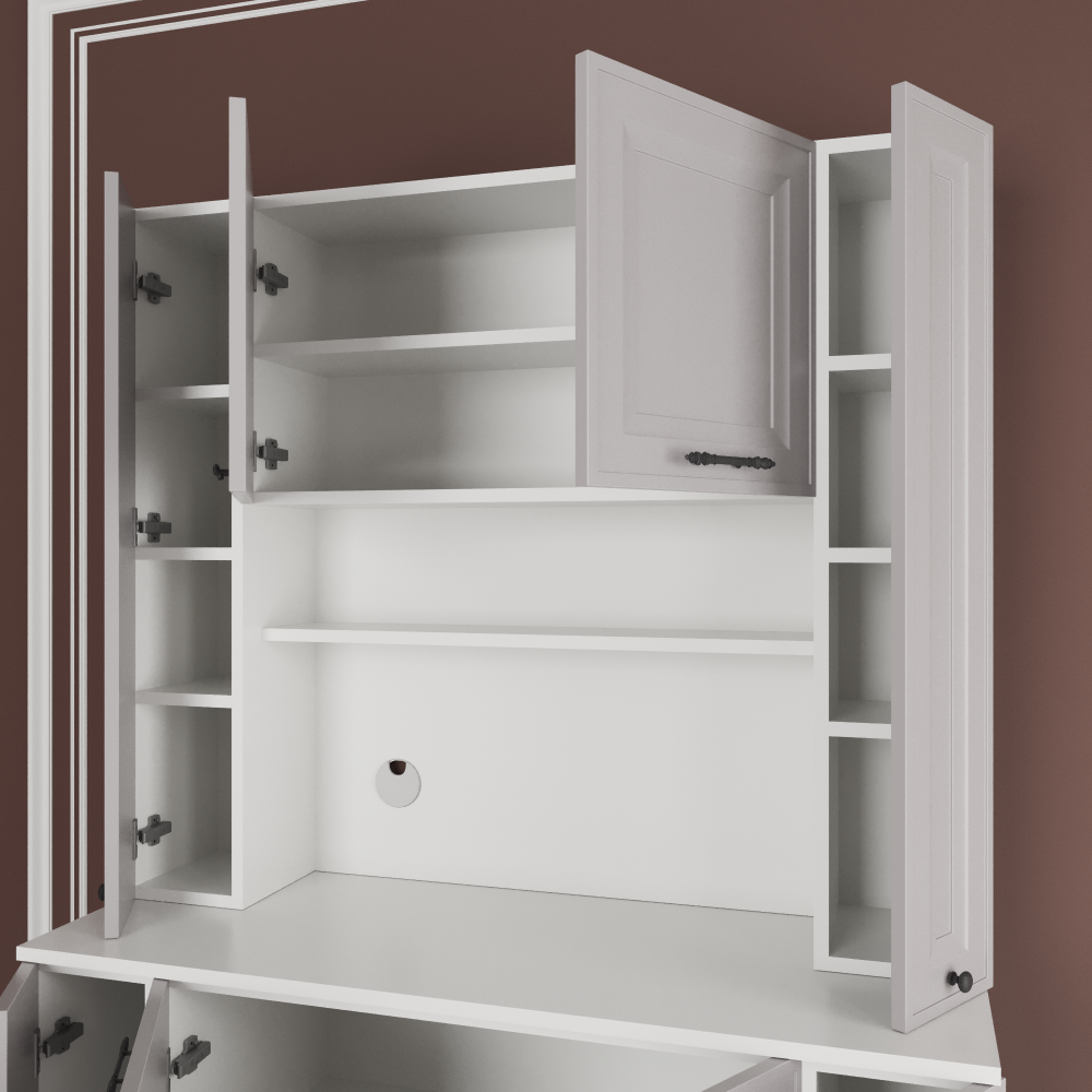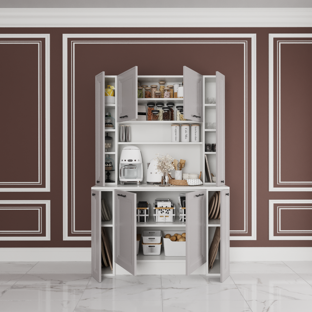 • Ürün sağ ve sol yanında bulunan yüksek dar dolaplar ekstra depolama alanı sağlarken, tepsiler, kesme tahtaları ve özel kahve fincanları için ayrı bir yer sunar.