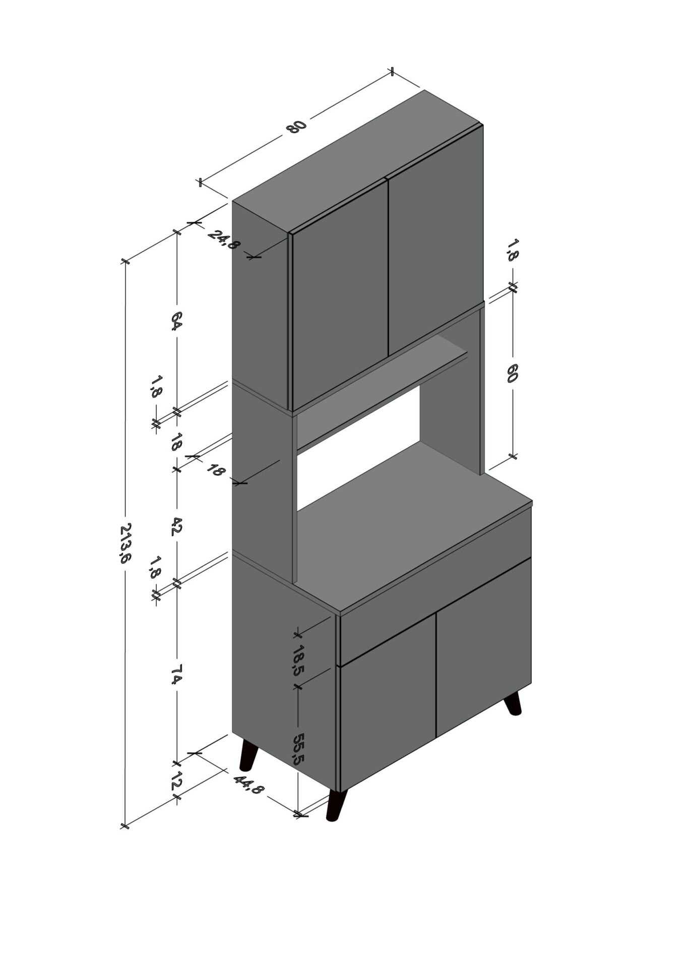 Derinlik: 44,8 cm (Alt Dolap) - 24,8 cm (Üst Dolap)