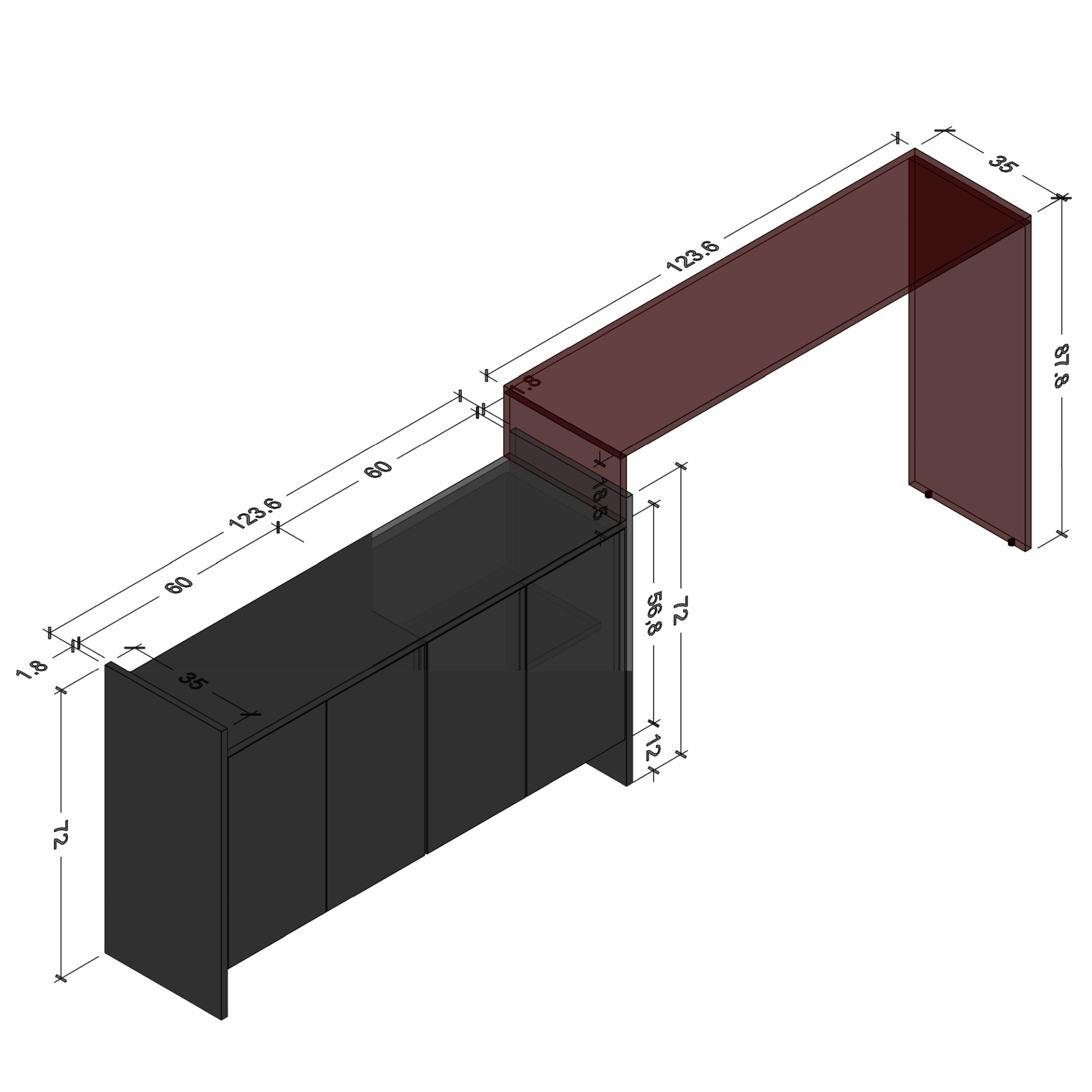 Genişlik: 123,6 cm dolap alanı + 123,6 cm banko alanı