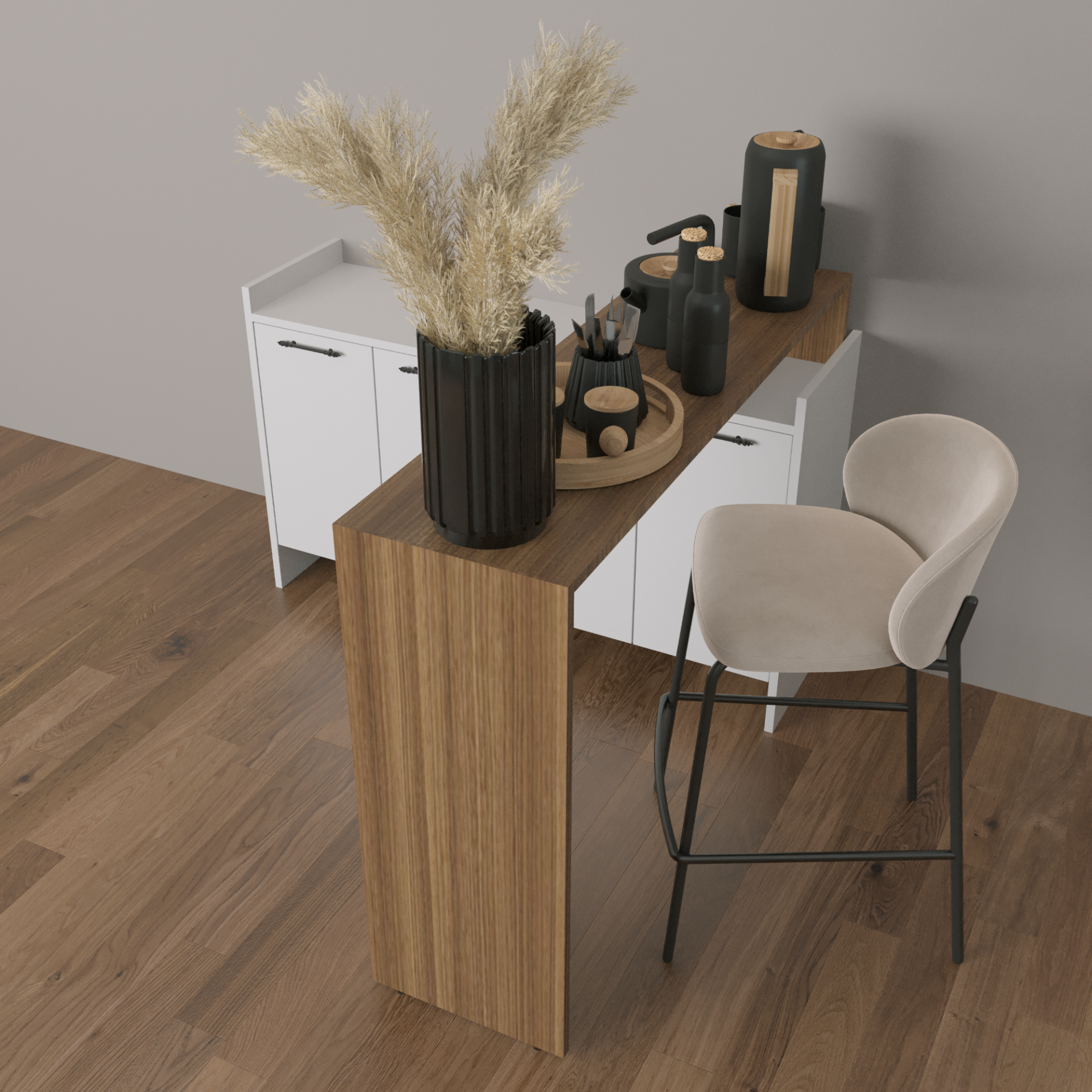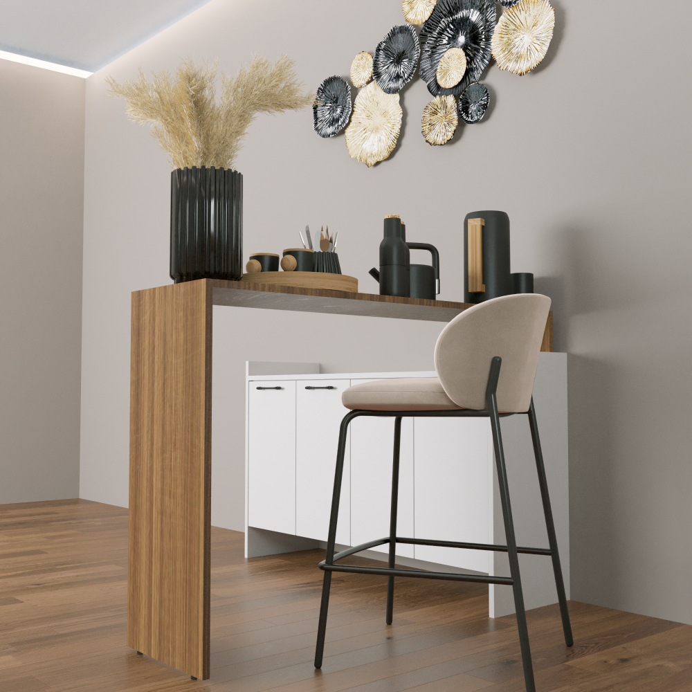 - Ürün içeriğinde bulunan hareketli özel tasarım banko, istenirse bar masası, sunum alanı, dresuar veya ilave tezgah olarak kullanılabilir.