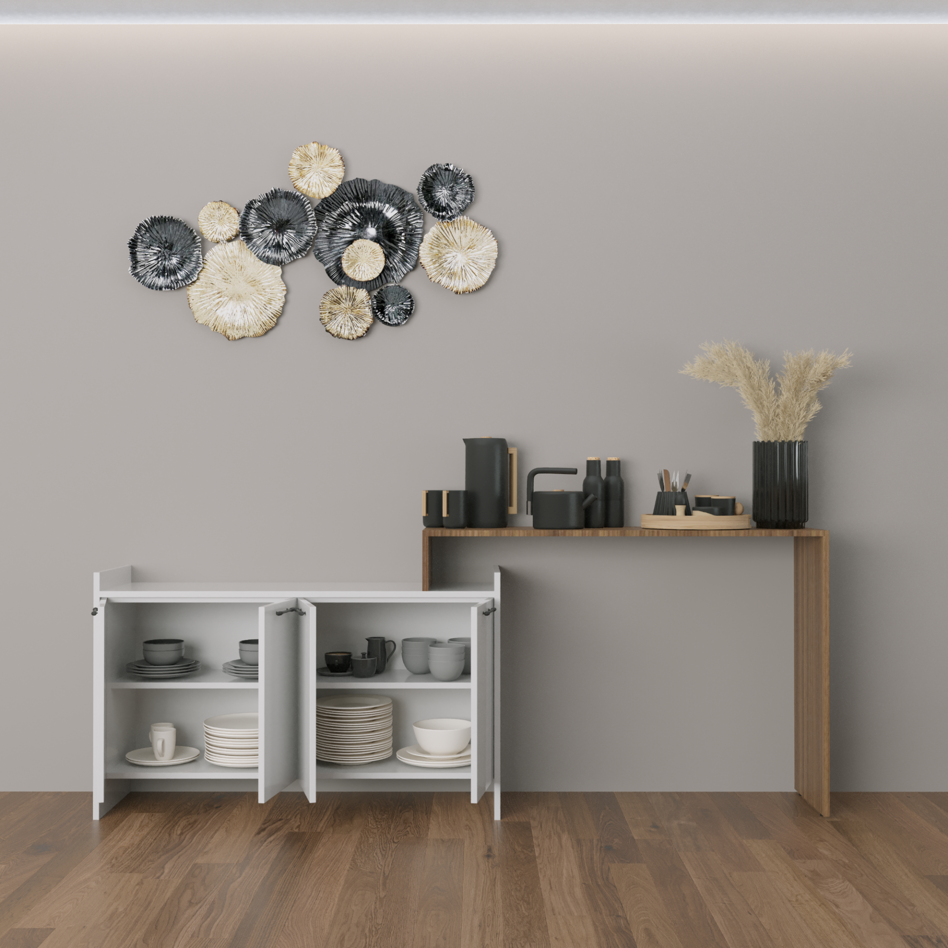 - BALISA-L 120 cm MDF Lam Parlak Beyaz & Mat Ceviz Çok Amaçlı Ünite, üzerinde bulunan hareketli banko sayesinde, ihtiyaç duyulduğu anda ekstra bir kullanım alanı sunar.
