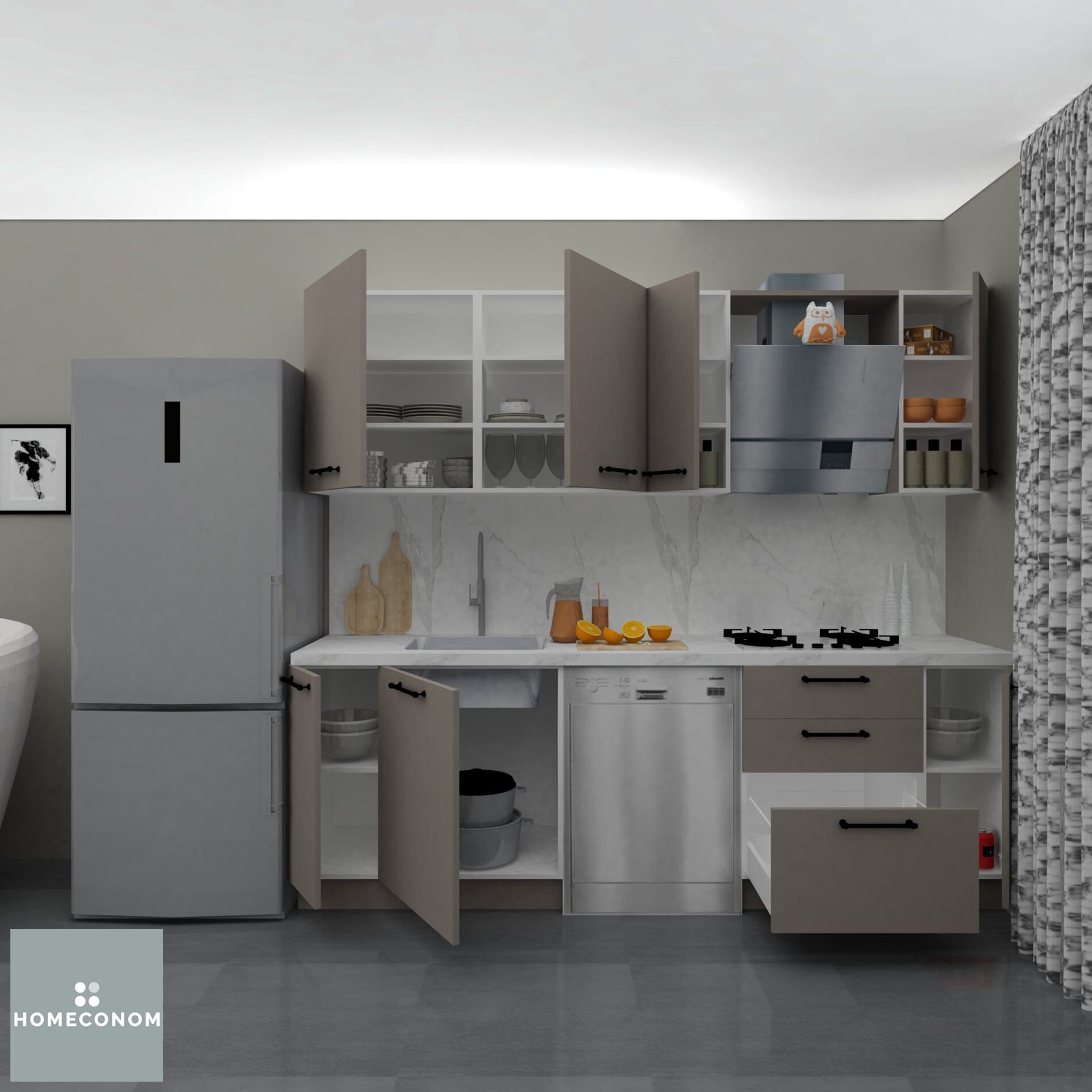 - Ürün görselinde bulunan; tezgah, duvar paneli / duvar seramiği, ankastre cihazlar, solo cihazlar, buzdolabı, evye ve armatür görsel amaçlı kullanılmış olup, içeriğe dahil değildir.