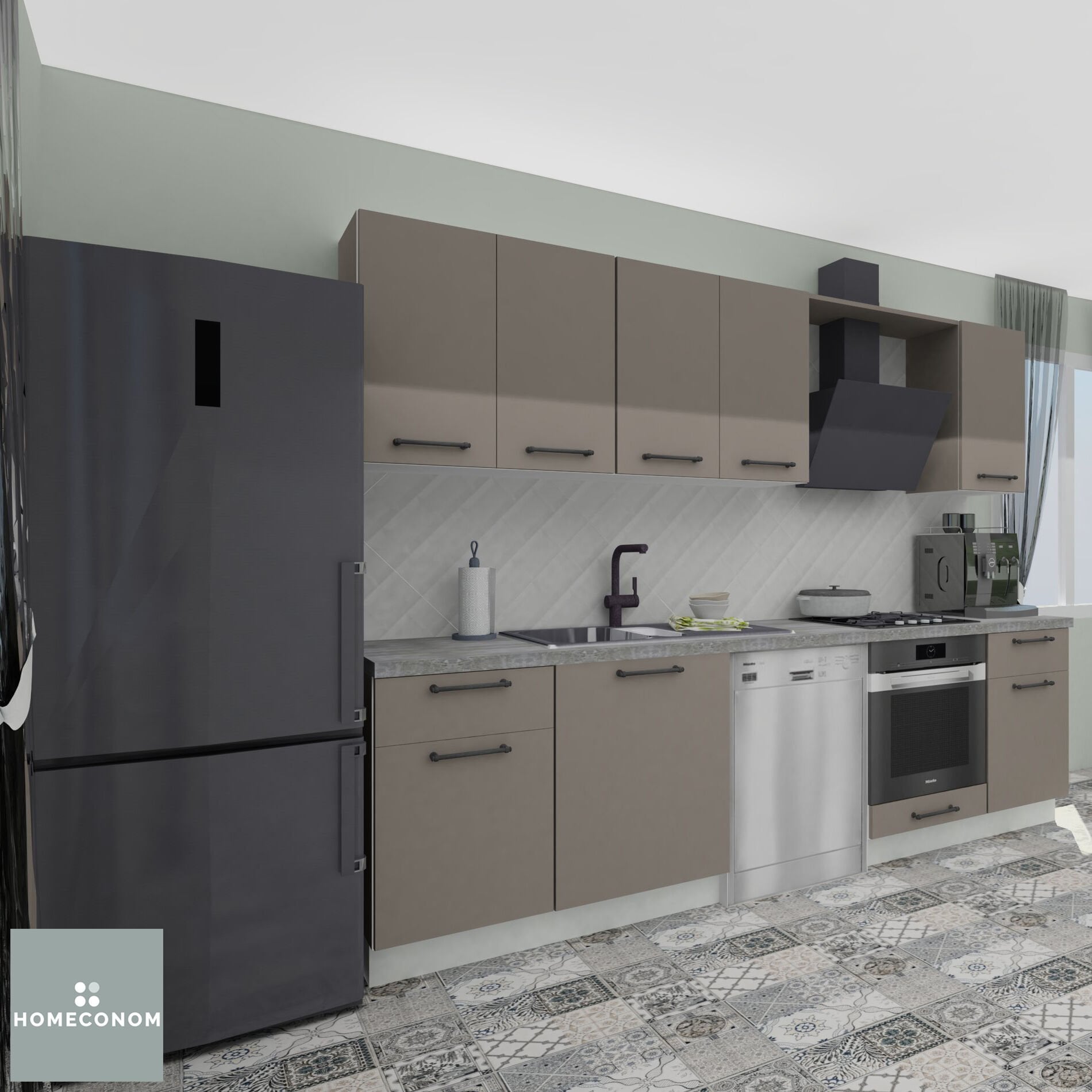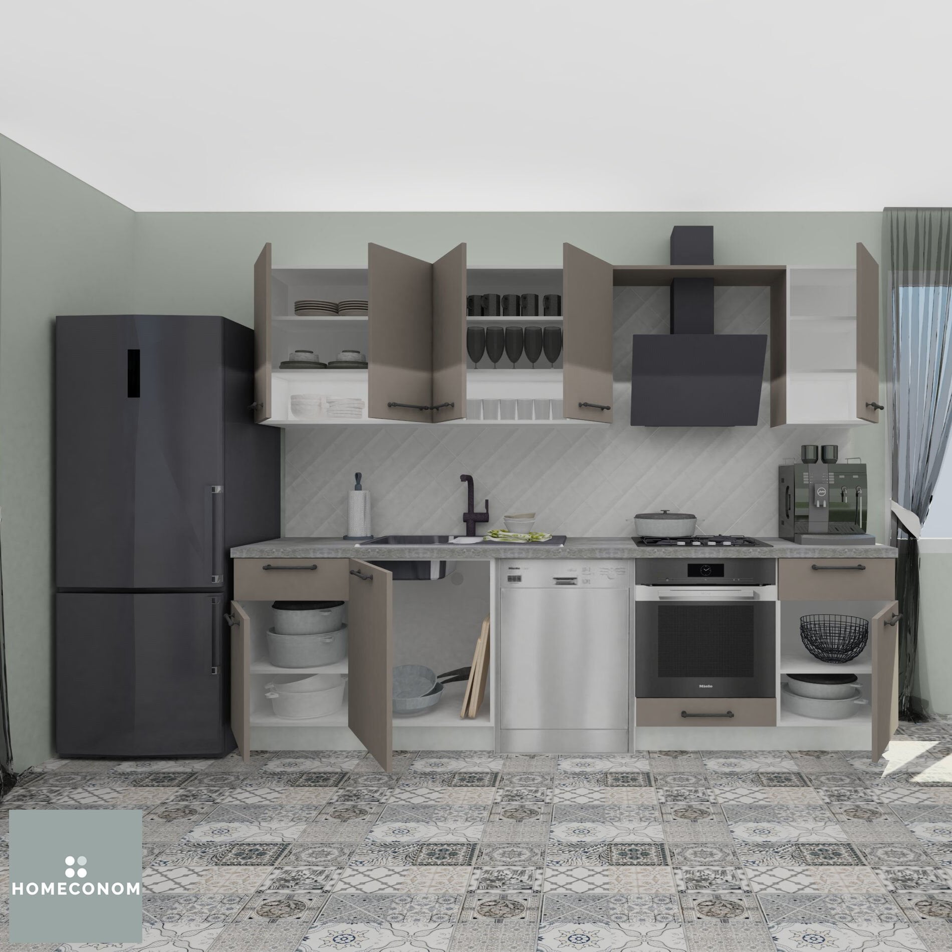 - Ürün görselinde bulunan; tezgah, duvar paneli / duvar seramiği, ankastre cihazlar, solo cihazlar, buzdolabı, evye ve armatür görsel amaçlı kullanılmış olup, içeriğe dahil değildir.