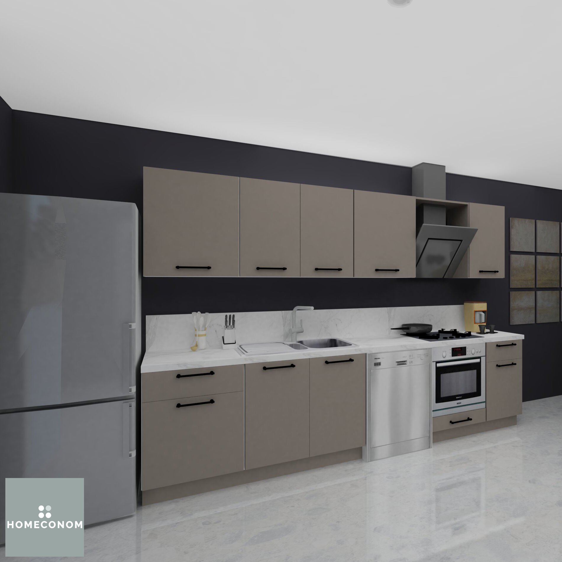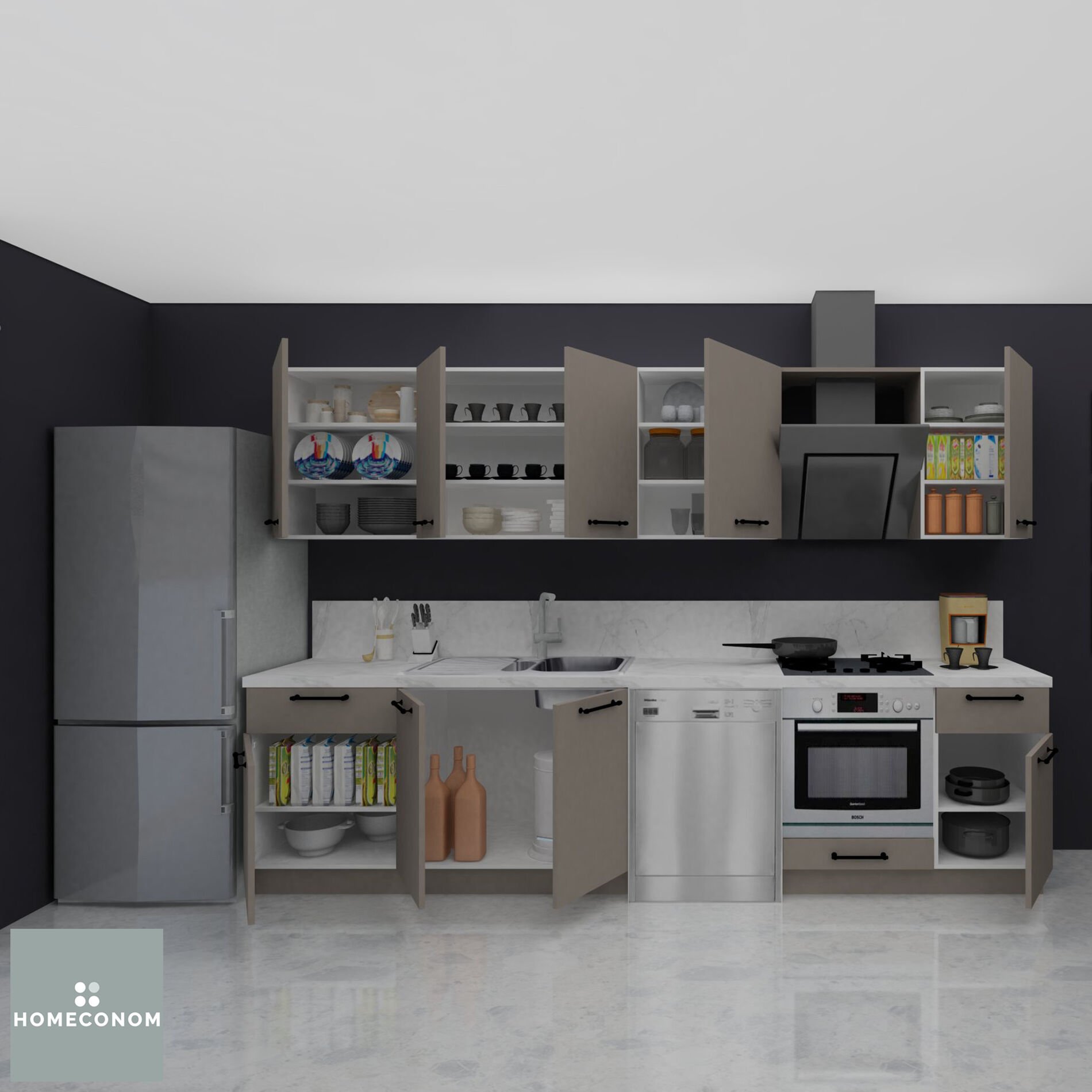 - Ürün görselinde bulunan; tezgah, duvar paneli / duvar seramiği, ankastre cihazlar, solo cihazlar, buzdolabı, evye ve armatür görsel amaçlı kullanılmış olup, içeriğe dahil değildir.