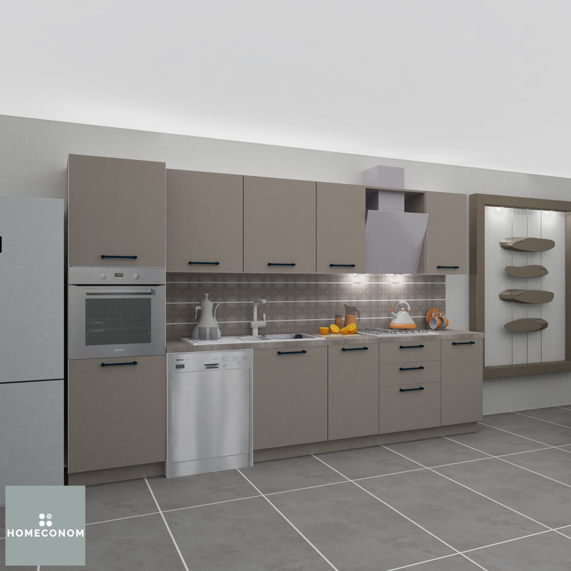 - Ürün görselinde bulunan; tezgah, duvar paneli / duvar seramiği, ankastre cihazlar, solo cihazlar, buzdolabı, evye ve armatür görsel amaçlı kullanılmış olup, içeriğe dahil değildir.