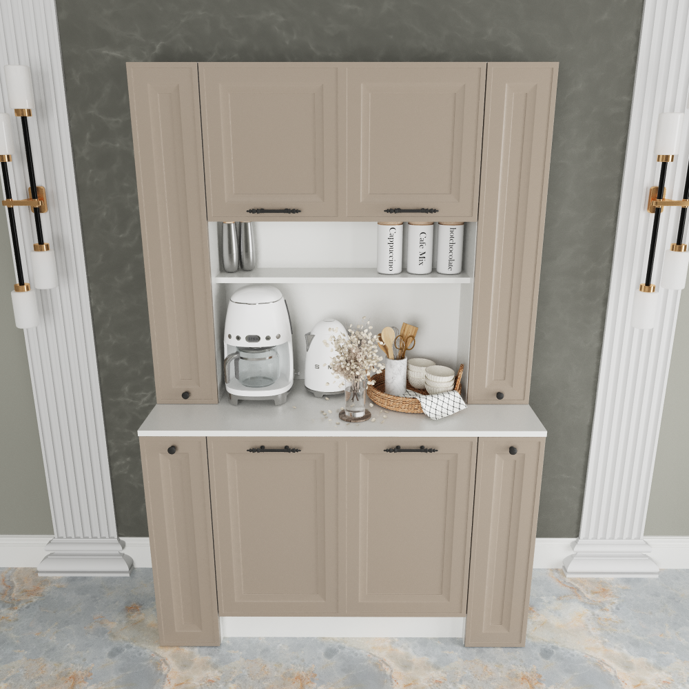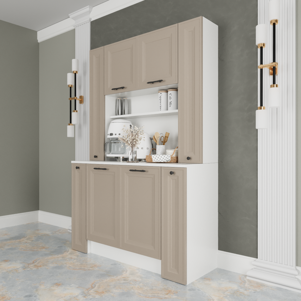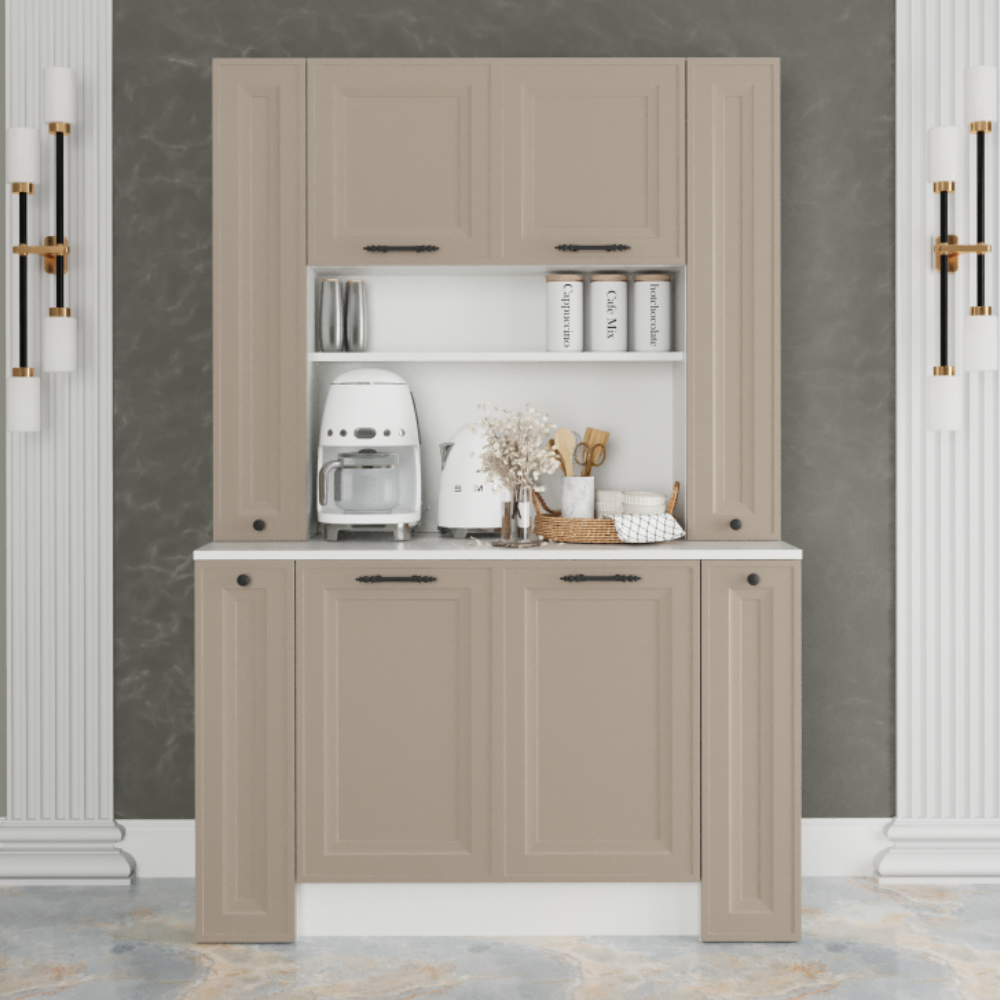 • Ürün sağ ve sol yanında bulunan yüksek dar dolaplar ekstra depolama alanı sağlarken, tepsiler, kesme tahtaları ve özel kahve fincanları için ayrı bir yer sunar.