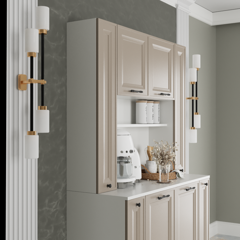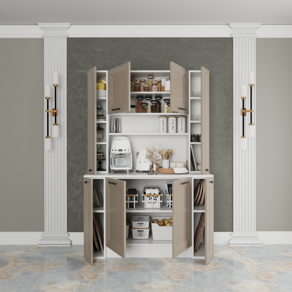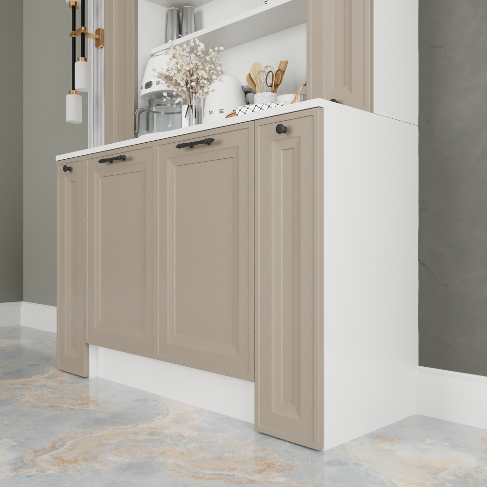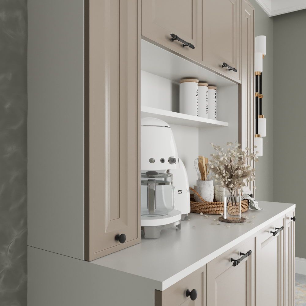 • Ürün sağ ve sol yanında bulunan yüksek dar dolaplar ekstra depolama alanı sağlarken, tepsiler, kesme tahtaları ve özel kahve fincanları için ayrı bir yer sunar.