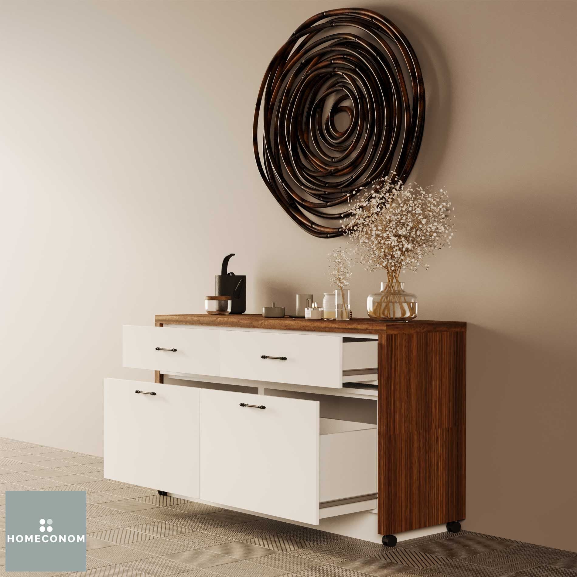 Larisa Large 140 cm Parlak Beyaz & Mat Ceviz MDF Lam Tekerlekli Çekmeceli Alt Dolaplı Ada Dolabı