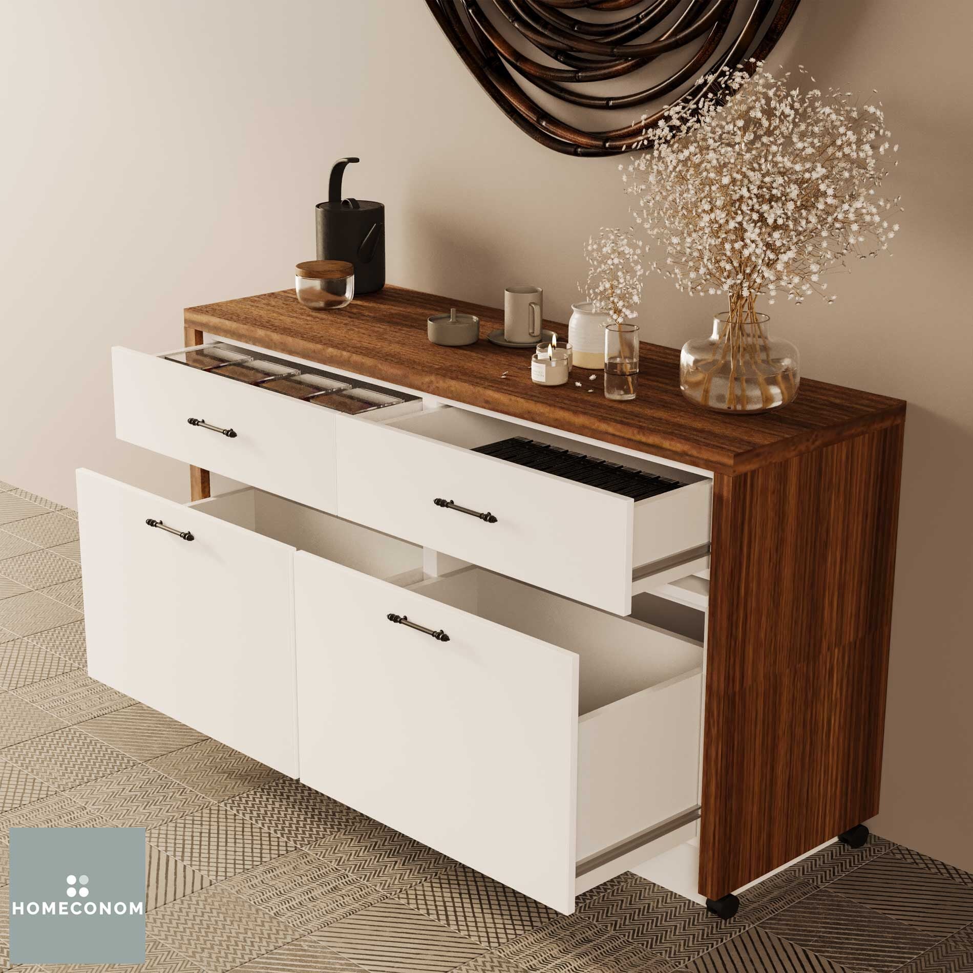 - Üstte bulunan çekmeceli etajer tekerlekli olup, masa olarak da kullanmaya imkan tanır. Altta bulunan konsol, üst etajere kombin ölçüdedir.