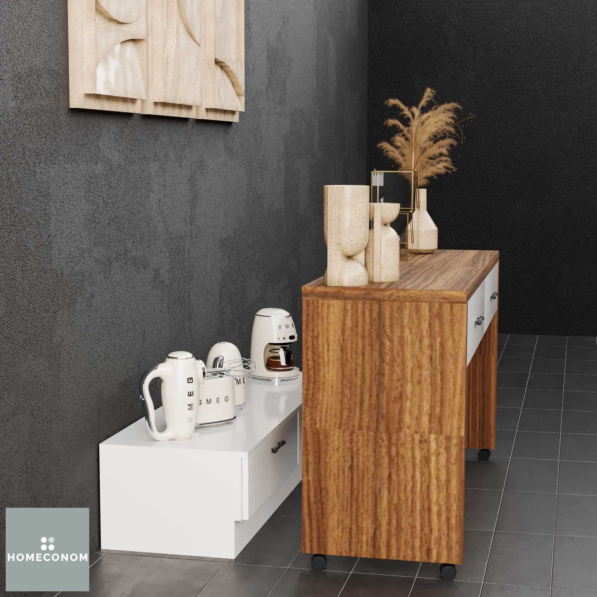 Larisa Middle 140 cm Parlak Beyaz & Mat Ceviz MDF Lam Tekerlekli Çekmeceli Kısa Alt Dolaplı Ada Dolabı
