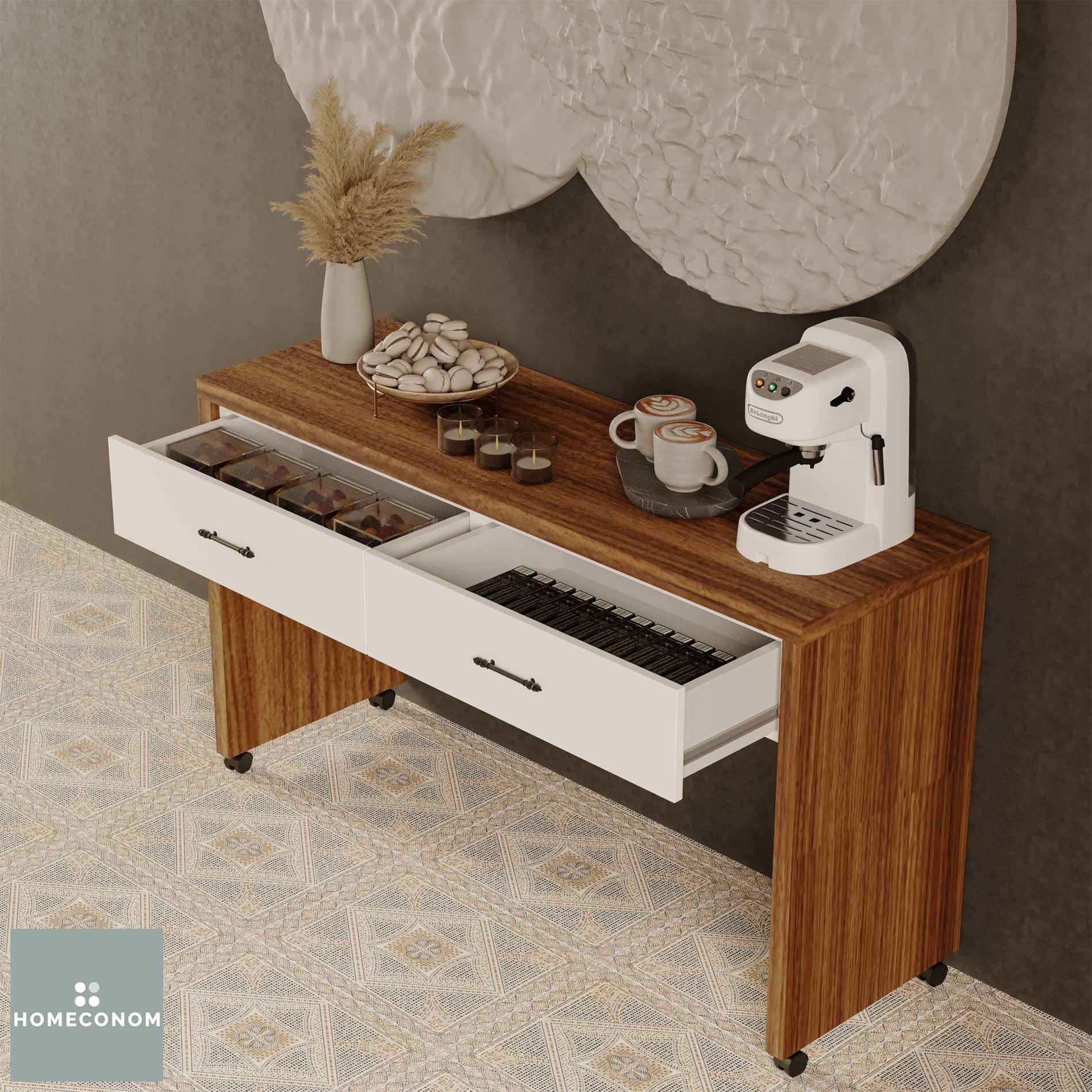 - Çekmeceli etajer tekerlekli olup, masa olarak da kullanmaya imkan tanır.
