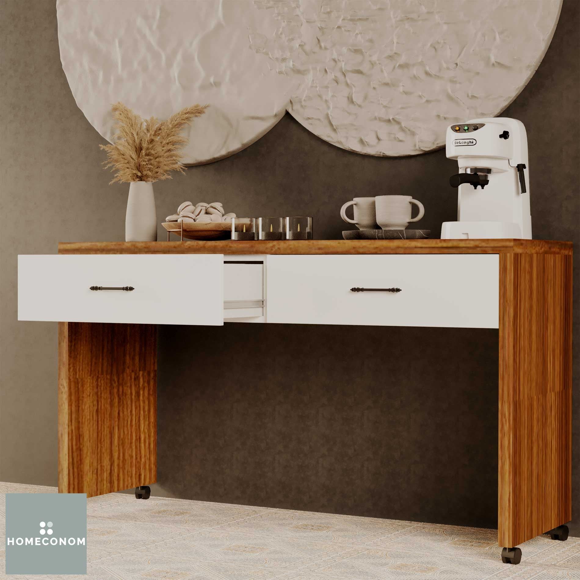 Larisa-S 140 cm Parlak Beyaz & Mat Ceviz MDF Lam Tekerlekli Çekmeceli Ada ve Dresuar