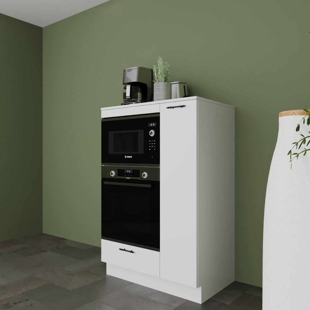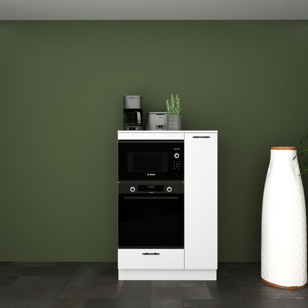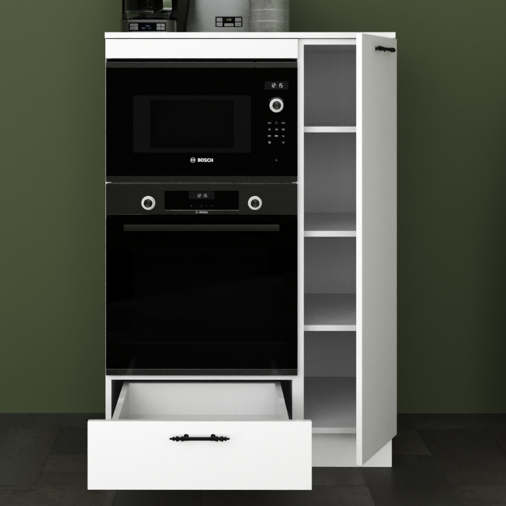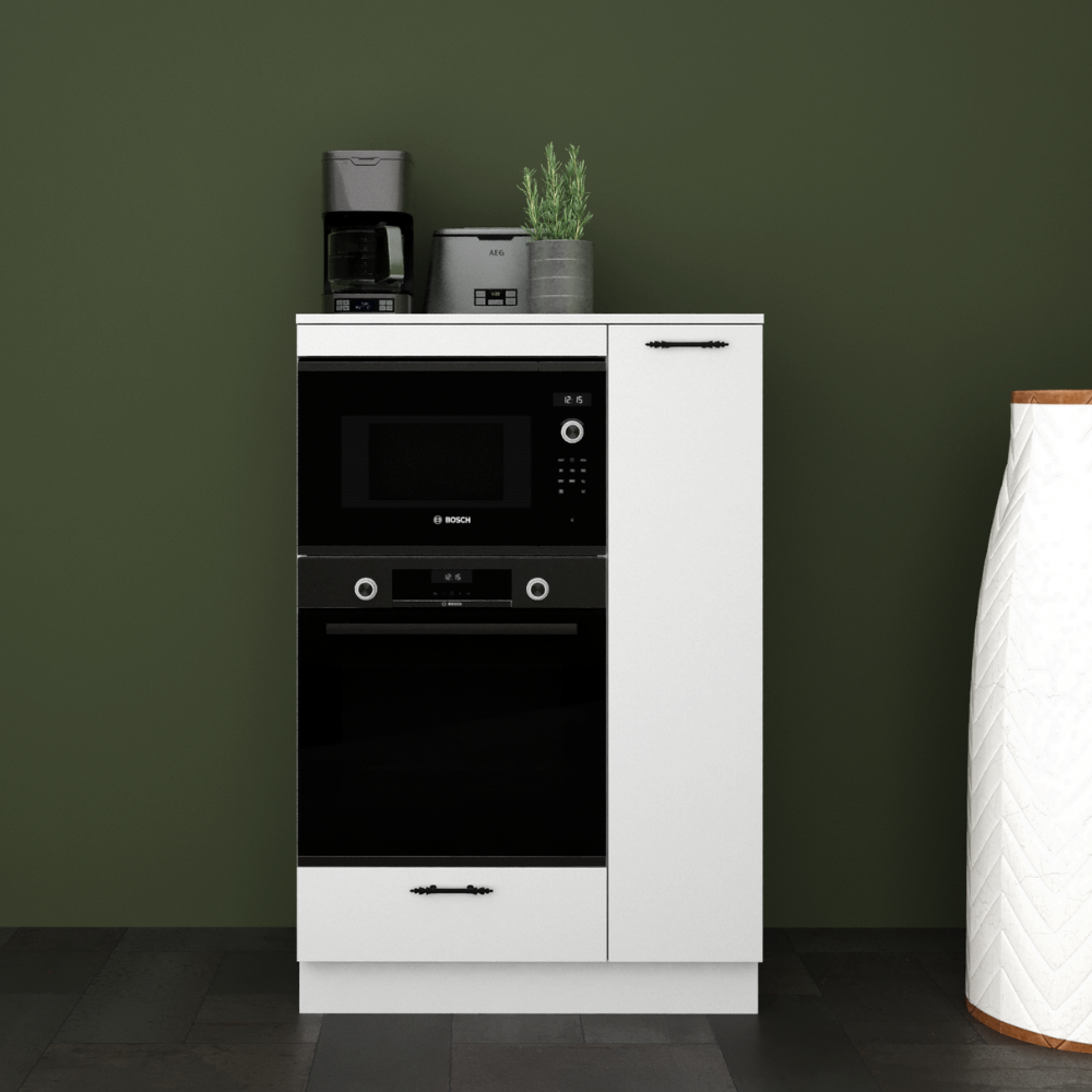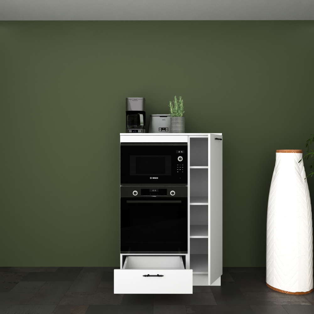 - MAYA COMPACT 90 cm Parlak Beyaz MDFLam Fırın ve Mikrodalga Yarım Boy Dolabı, fırın ve mikrodalganızı yerleştirmek alan sağlarken, alt kısmındaki çekmece ve yanında bulunan 4 bölümlü kiler dolabı ile de depolama alanı sunar.