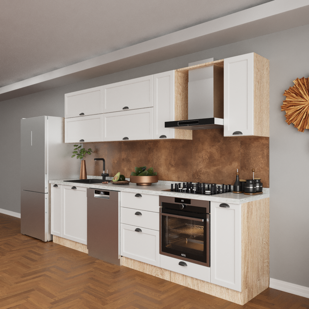 Mira 300 cm Mutfak Dolabı Mat İpeksi Beyaz Membran Kapak & Mat Meşe MDF Lam Gövde
