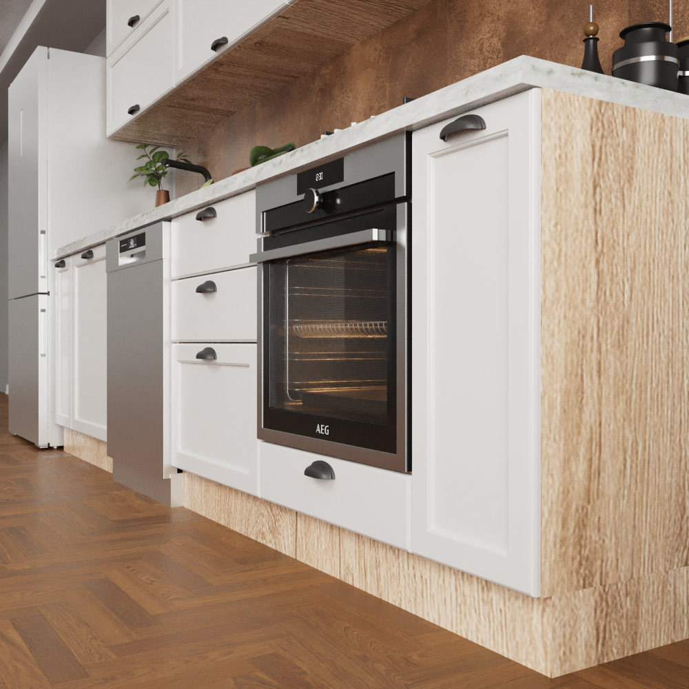 - Mira 300 cm Mutfak Dolabı tasarımınında Beyaz Membran kapak ile Mat Meşe MDF Lam gövde kombinasyonu kullanılmaktadır. Dolap iç rafları ve arkalıkları mat beyaz renktedir.