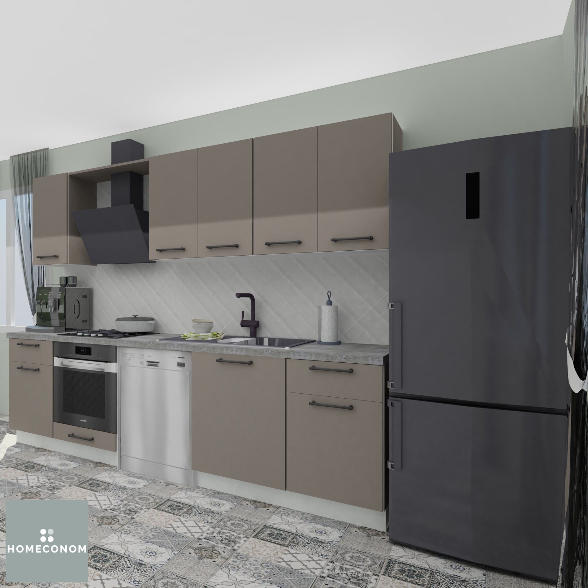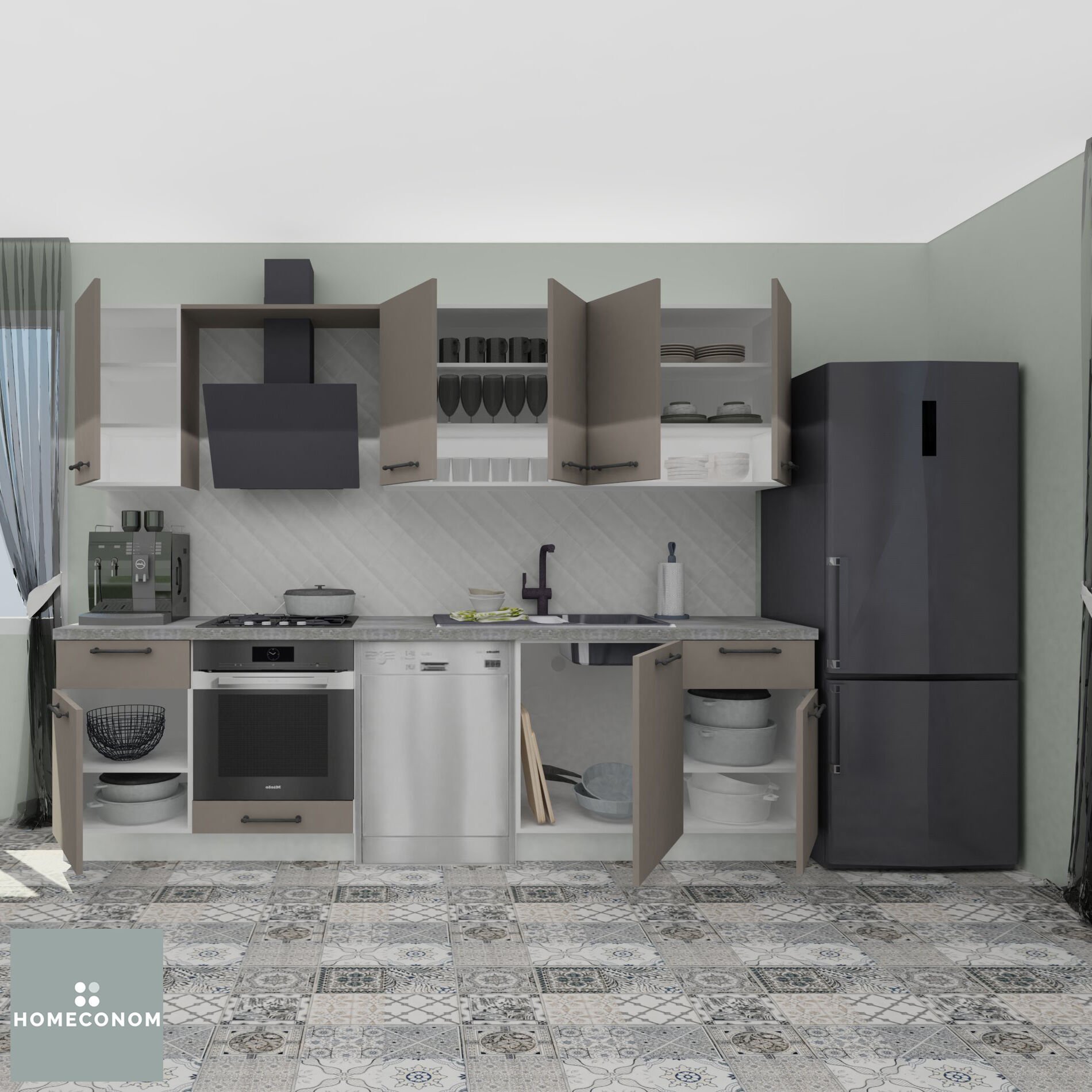 - Ürün görselinde bulunan; tezgah, duvar paneli / duvar seramiği, ankastre cihazlar, solo cihazlar, buzdolabı, evye ve armatür görsel amaçlı kullanılmış olup, içeriğe dahil değildir.
