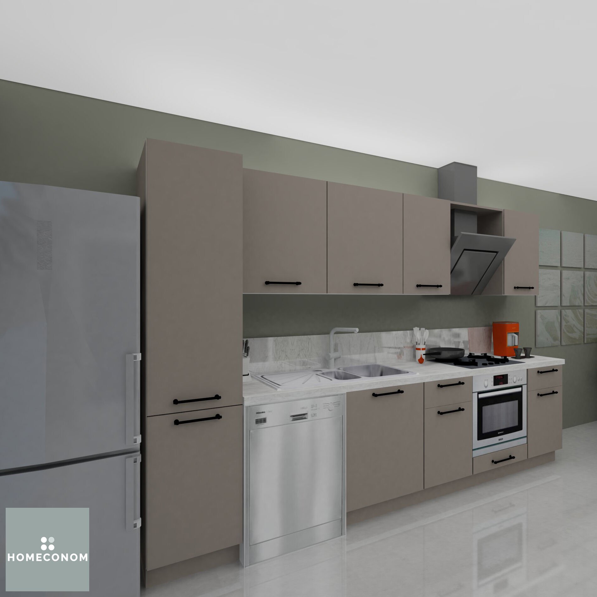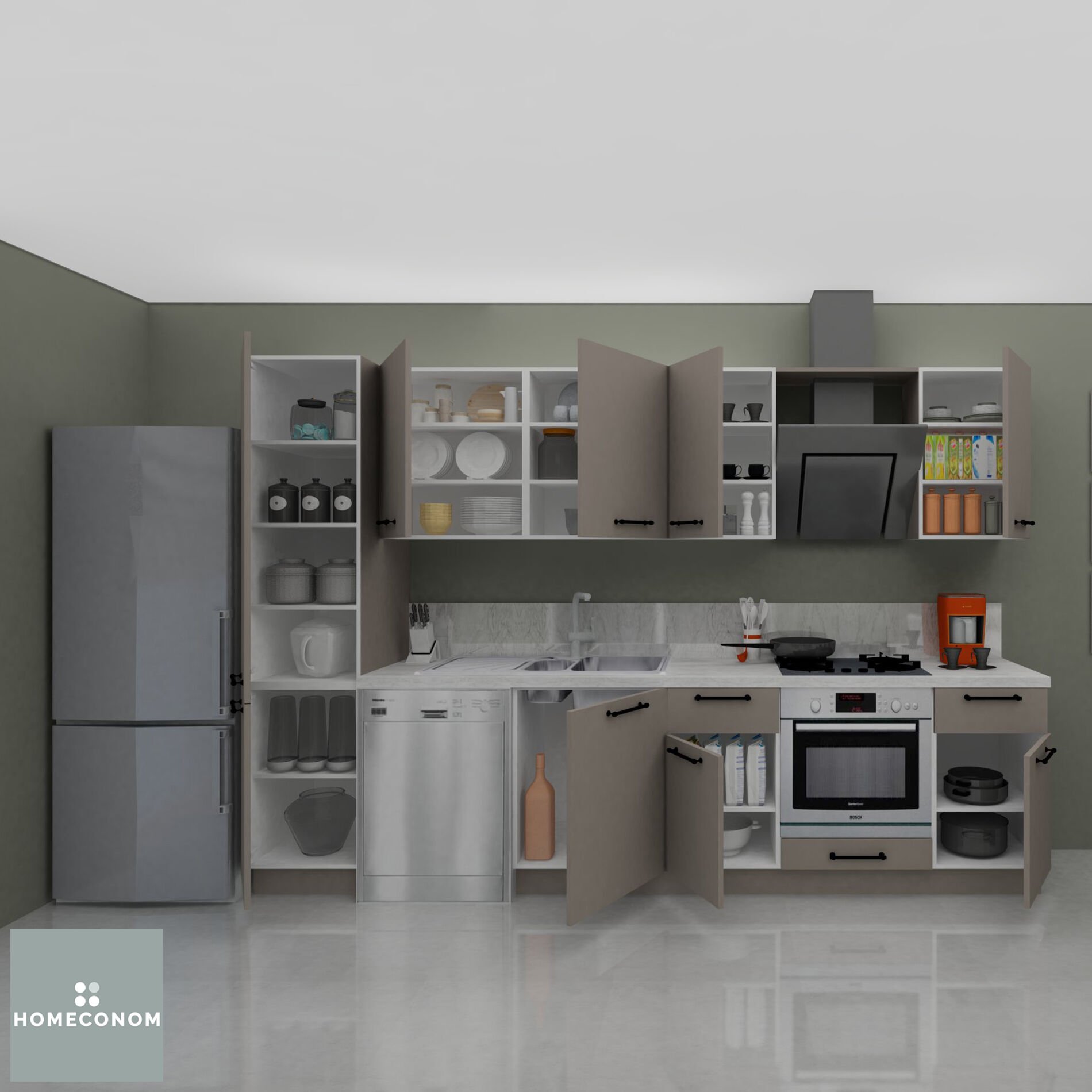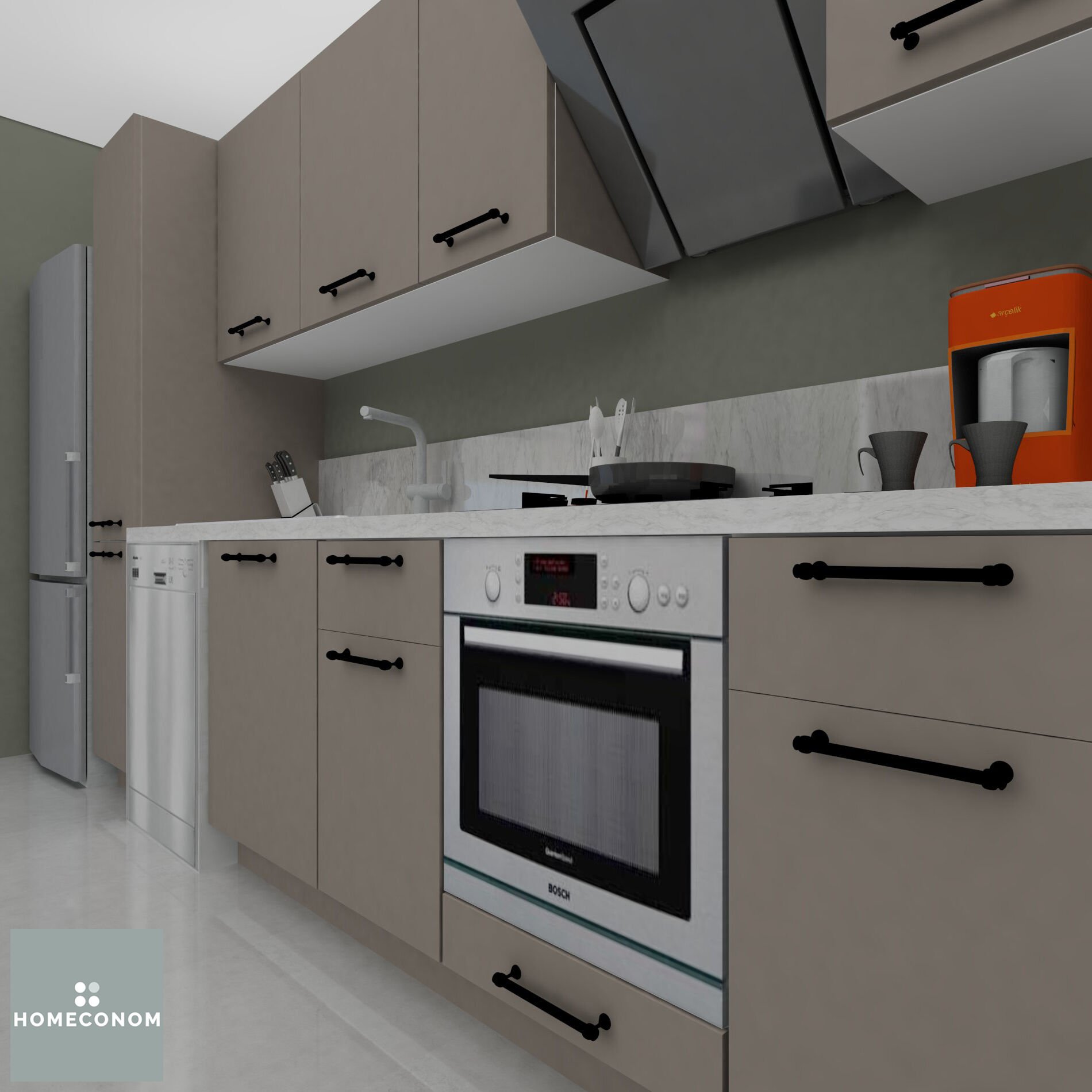 - Ürün görselinde bulunan; tezgah, duvar paneli / duvar seramiği, ankastre cihazlar, solo cihazlar, buzdolabı, evye ve armatür görsel amaçlı kullanılmış olup, içeriğe dahil değildir.