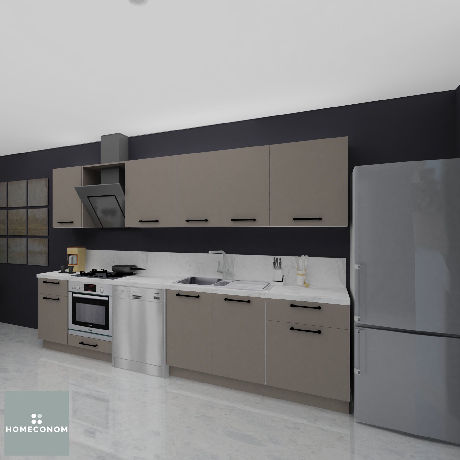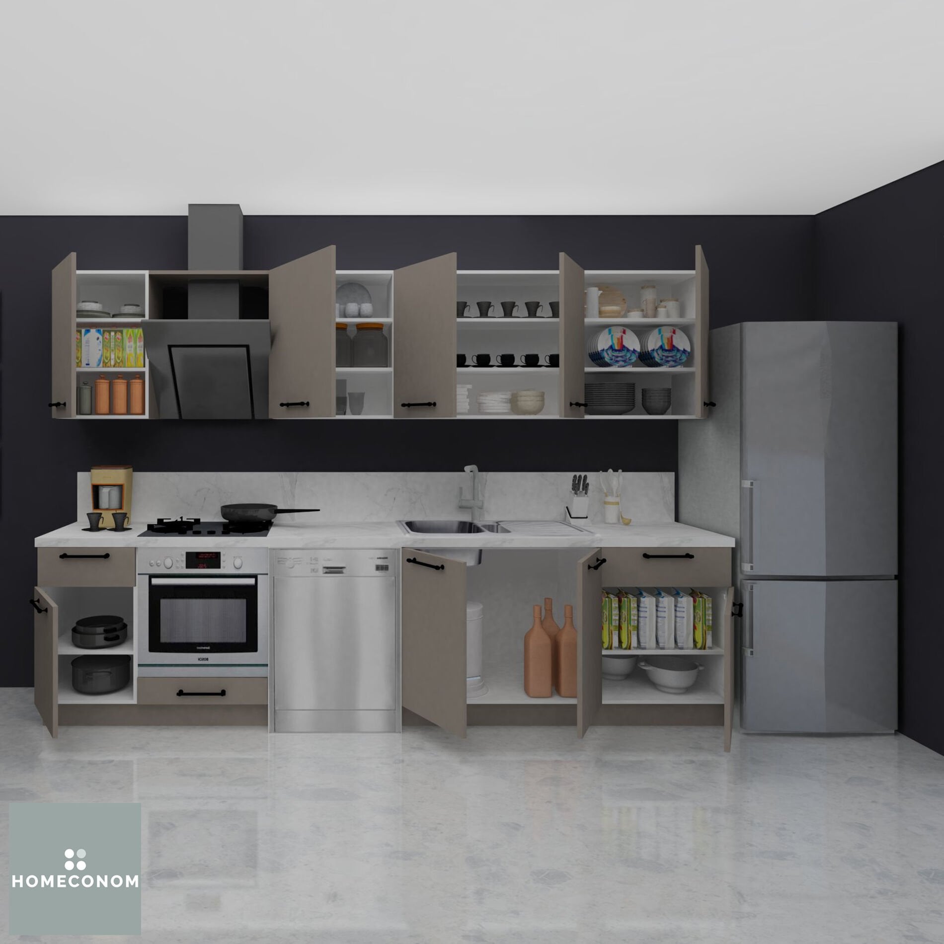 - Ürün görselinde bulunan; tezgah, duvar paneli / duvar seramiği, ankastre cihazlar, solo cihazlar, buzdolabı, evye ve armatür görsel amaçlı kullanılmış olup, içeriğe dahil değildir.