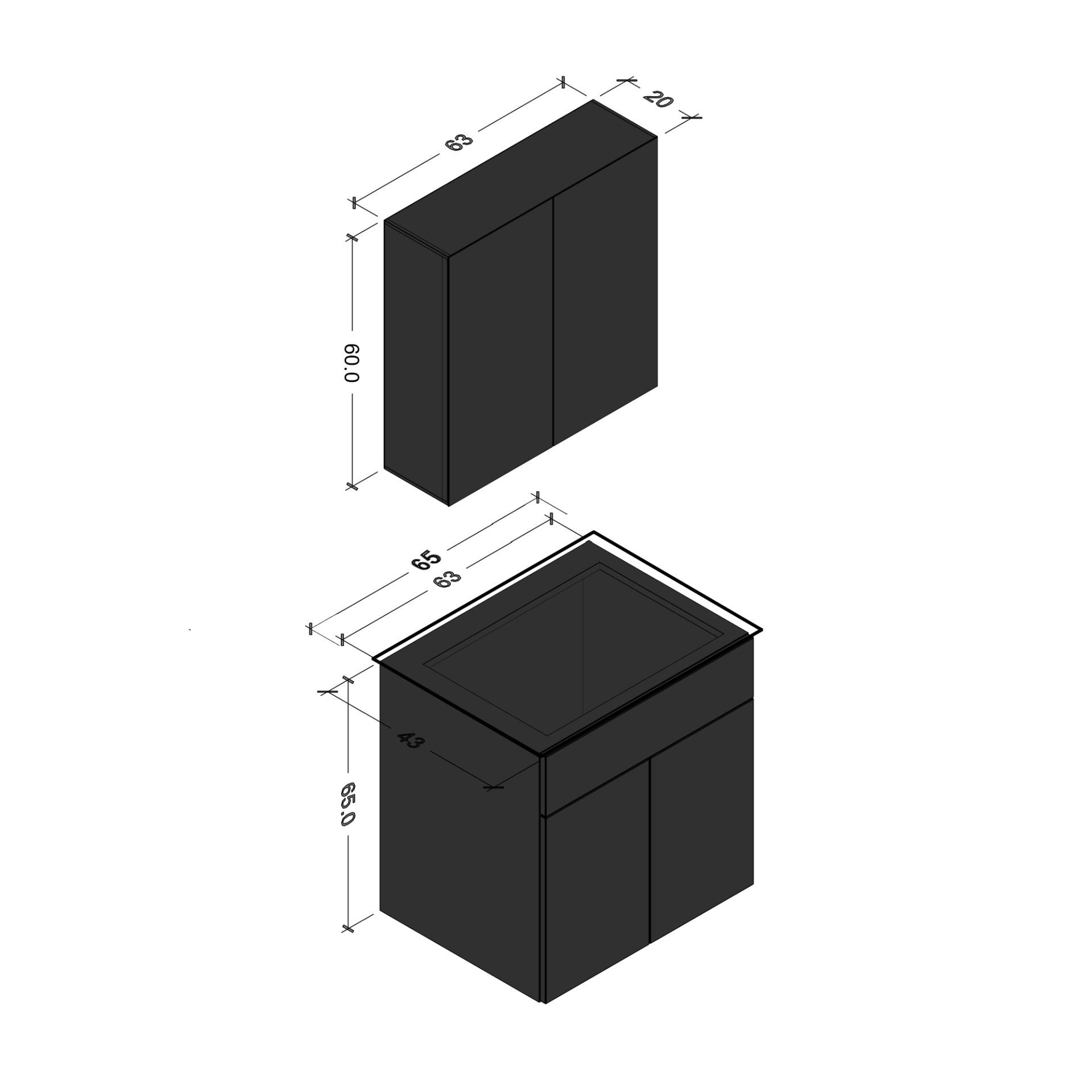 Yükseklik: 67 cm lavabo – 65 cm üst dolap