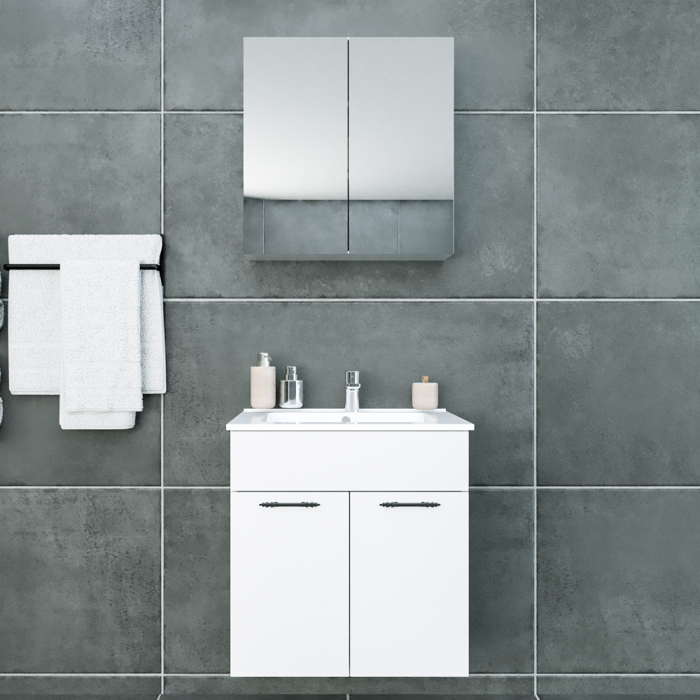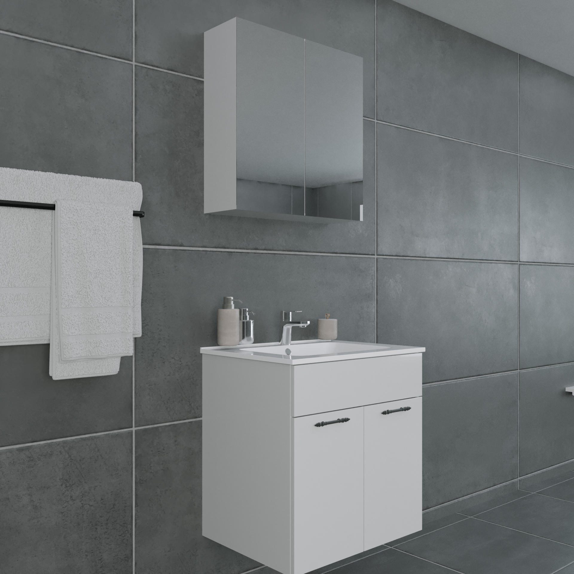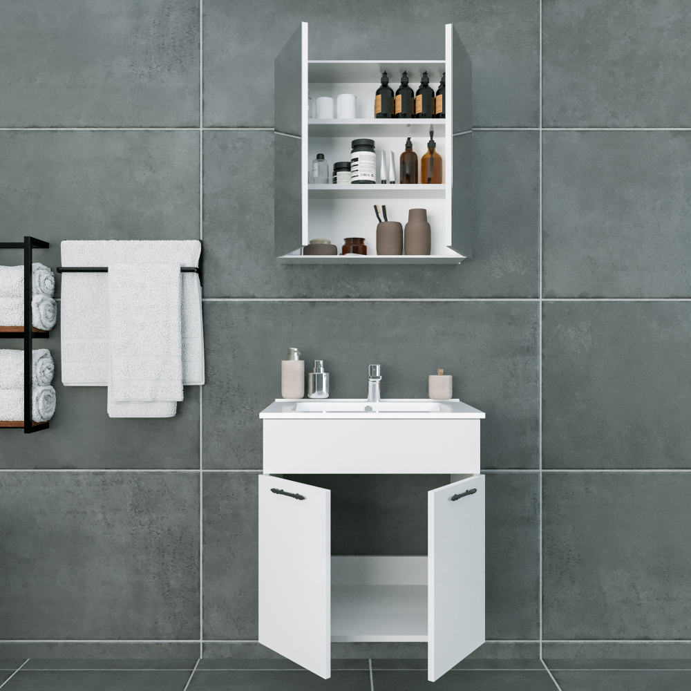 - REGNUM 65 cm Etajerli Lavabolu MDF Lam Parlak Beyaz Banyo Dolabı Takımı, lavabo dolabı, etajerli lavabosu ve ayna kapaklı üst dolabı ile takım halindedir.