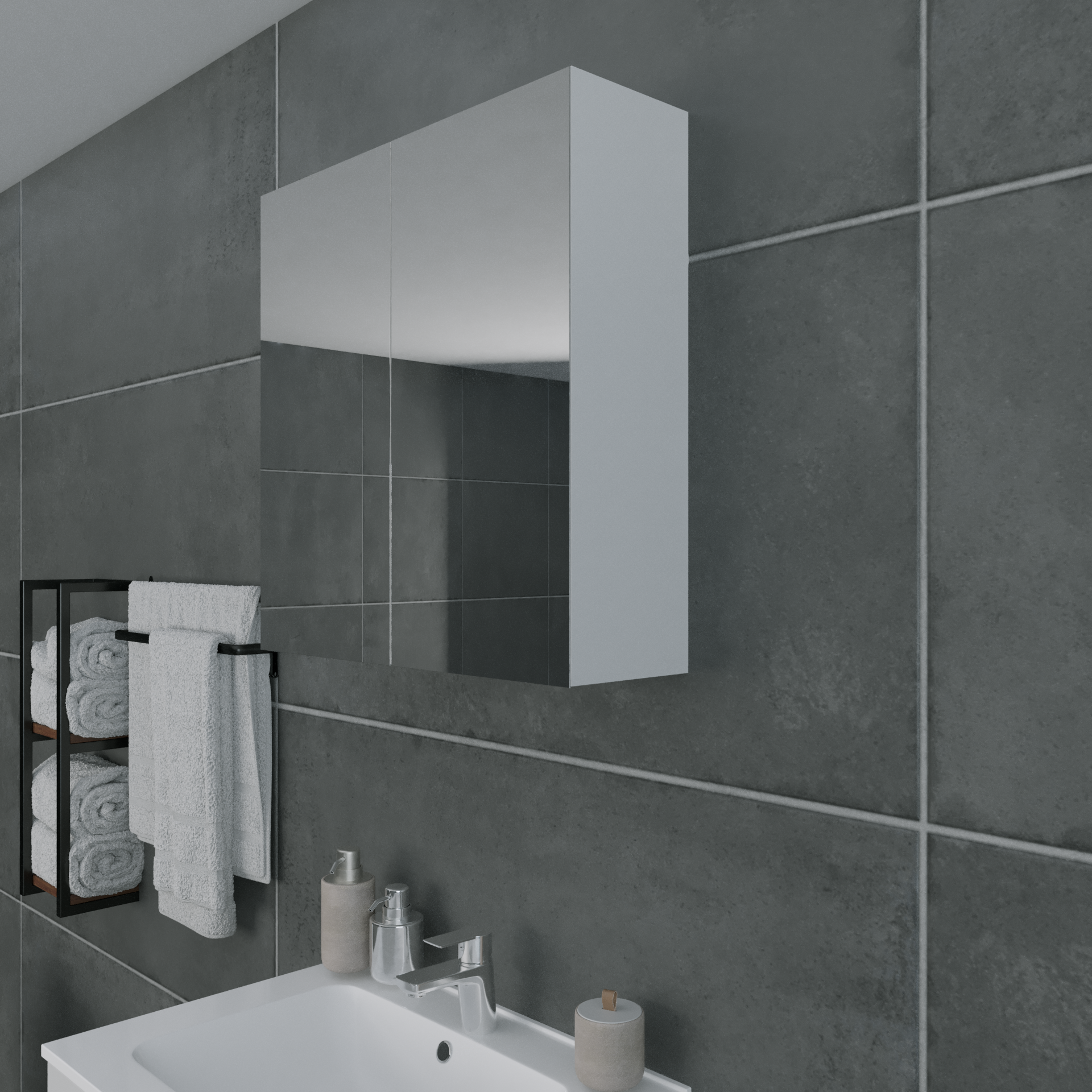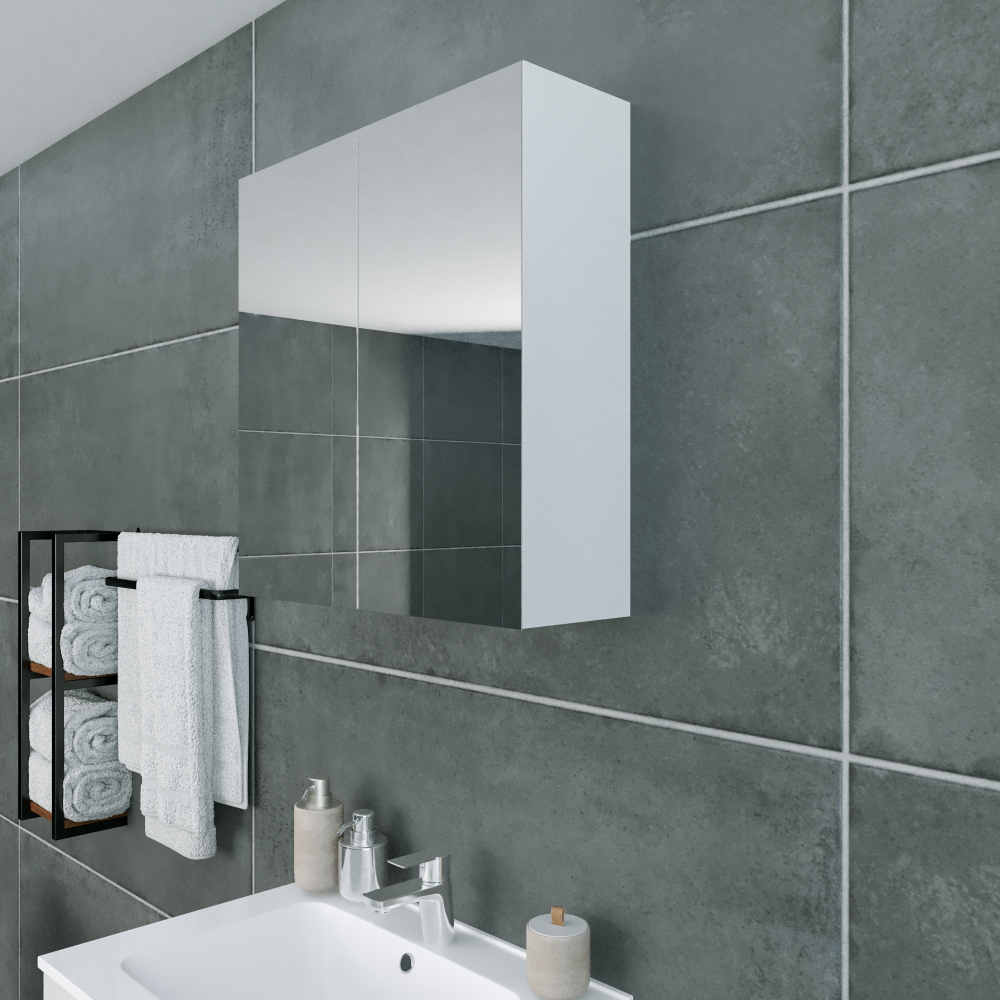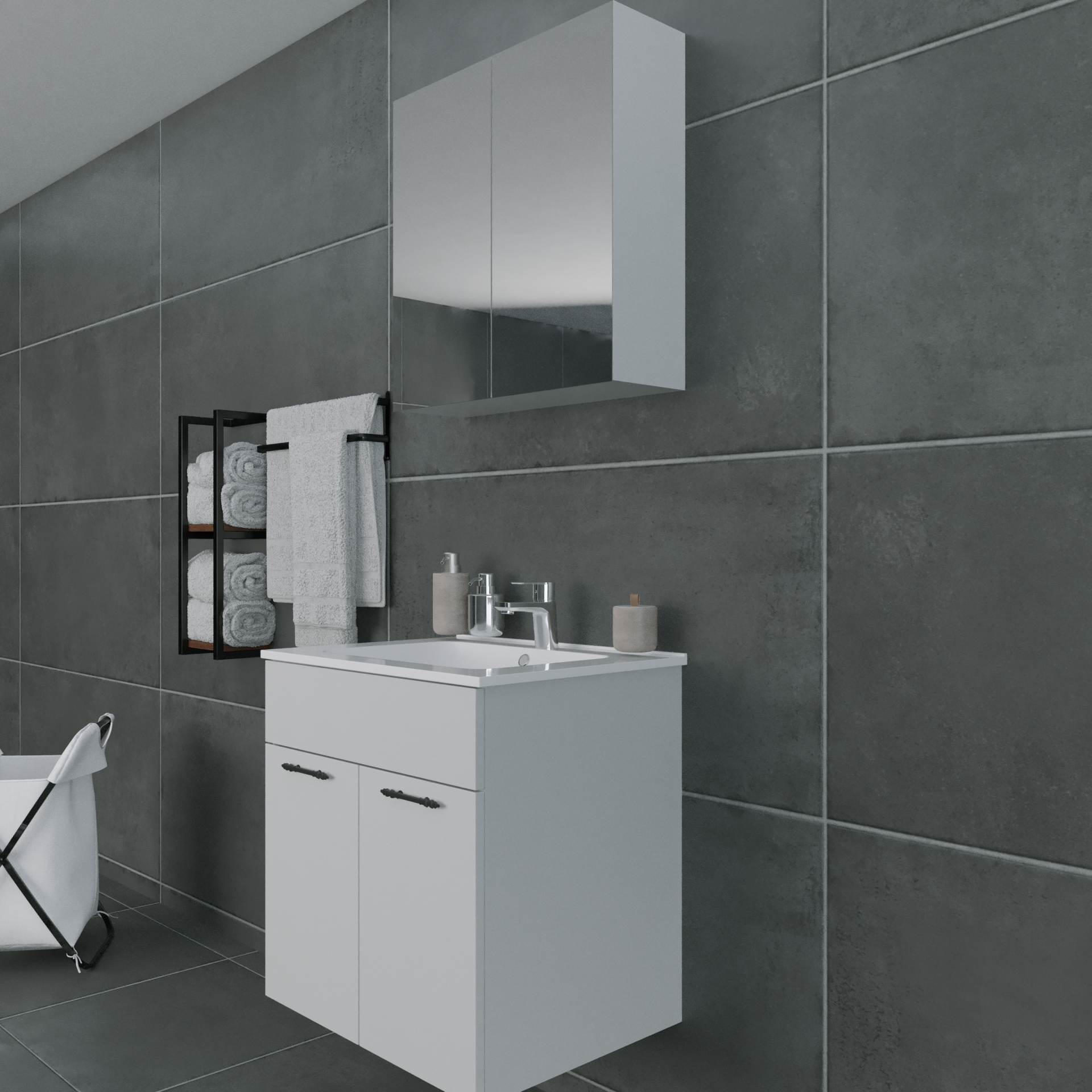- REGNUM 65 cm Etajerli Lavabolu MDF Lam Parlak Beyaz Banyo Dolabı Takımı, lavabo dolabı, etajerli lavabosu ve ayna kapaklı üst dolabı ile takım halindedir.