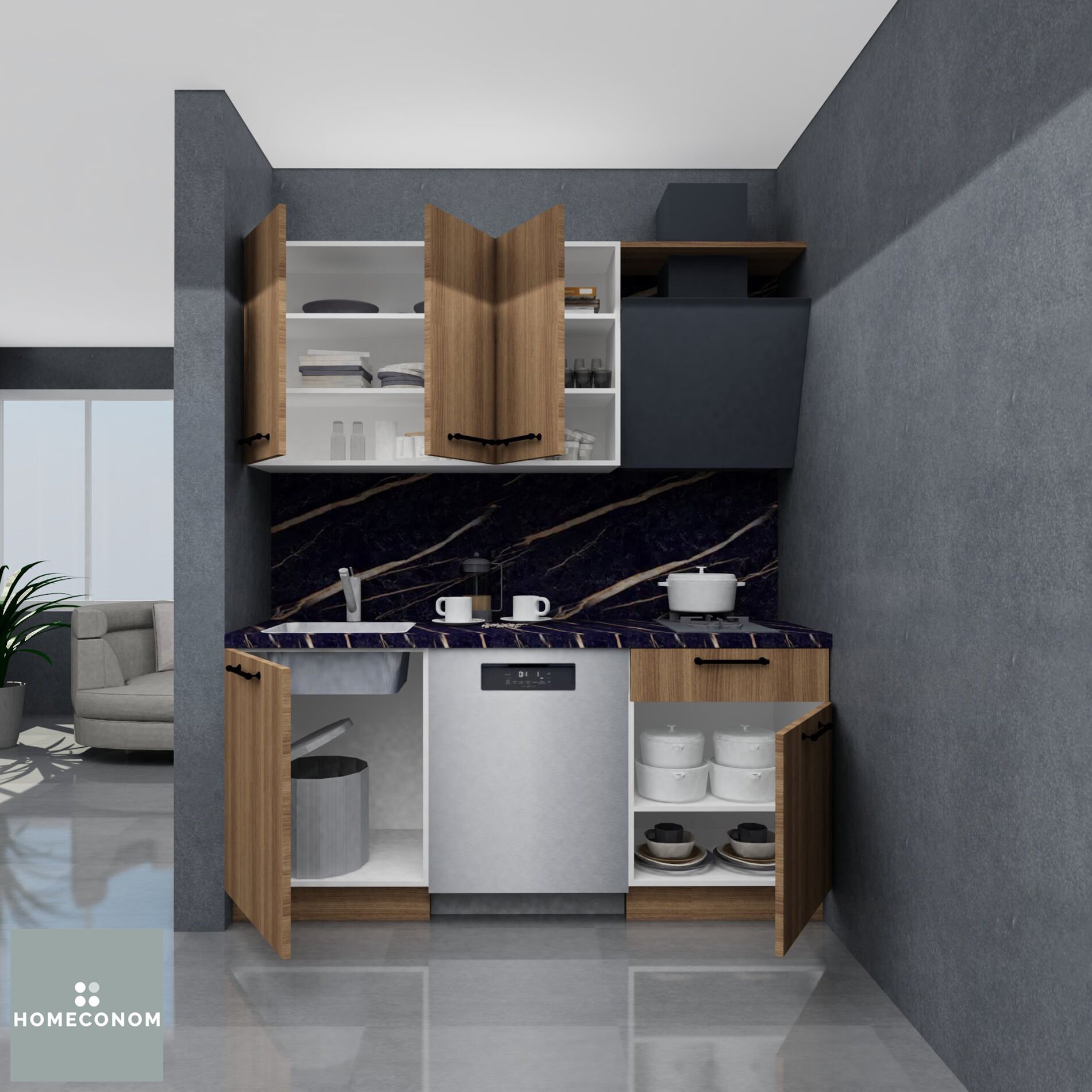 - Ürün görselinde bulunan; tezgah, duvar paneli / duvar seramiği, ankastre cihazlar, solo cihazlar, buzdolabı, evye ve armatür görsel amaçlı kullanılmış olup, içeriğe dahil değildir.