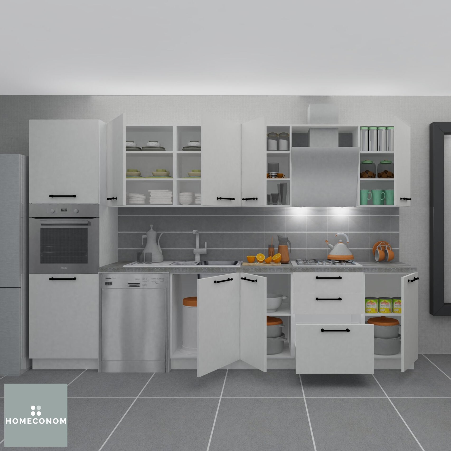 - Mutfak dolaplarımızda; alt dolaplarda 1 iç raf, üst dolaplarda 2 iç raf, fırın boy dolabında ise 2 iç raf bulunmaktadır.