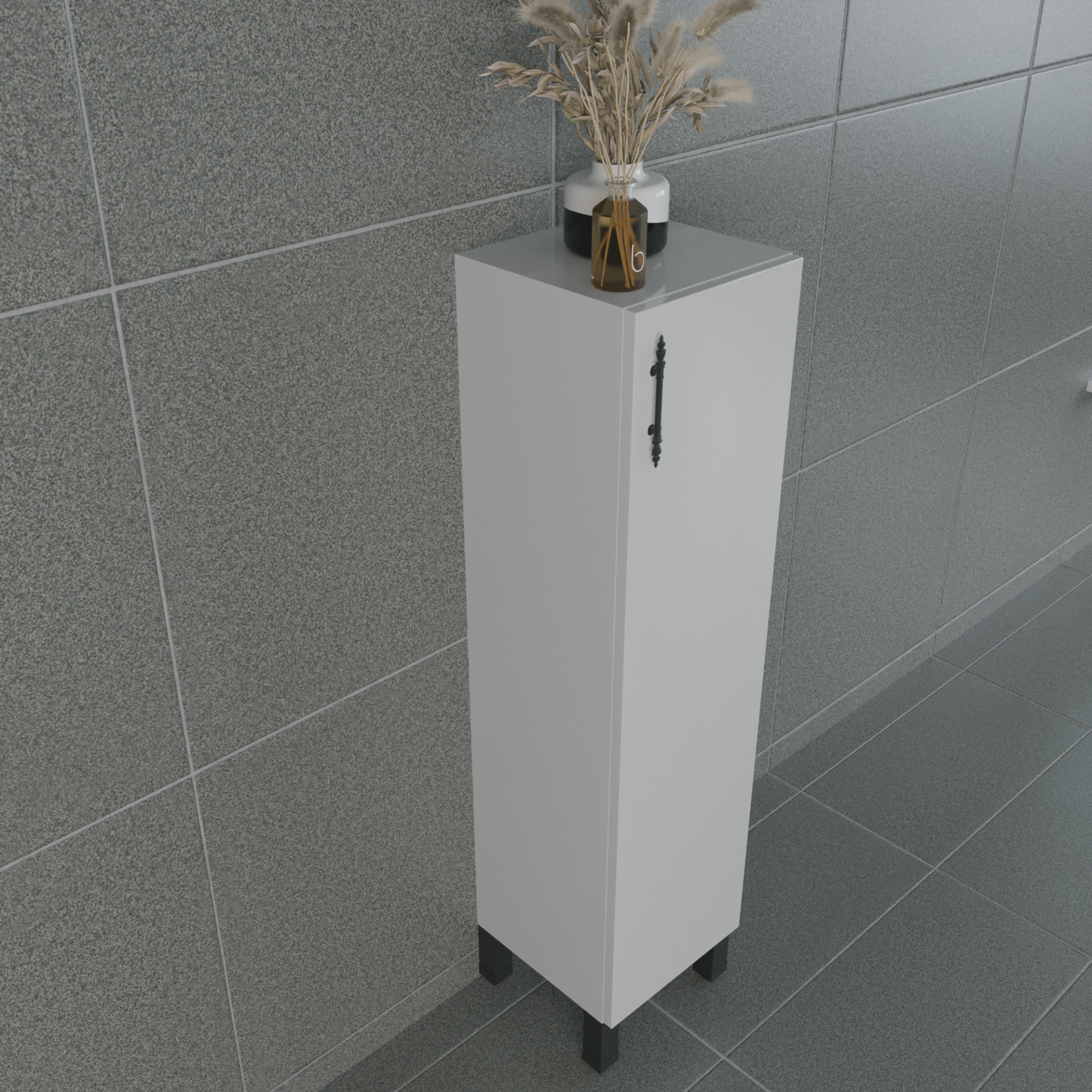 Şık siyah ayak ve kulplarıyla dikkat çeken, kullanışlı rafları sayesinde her alanda ekstra depolama sağlayan hazır dolap.